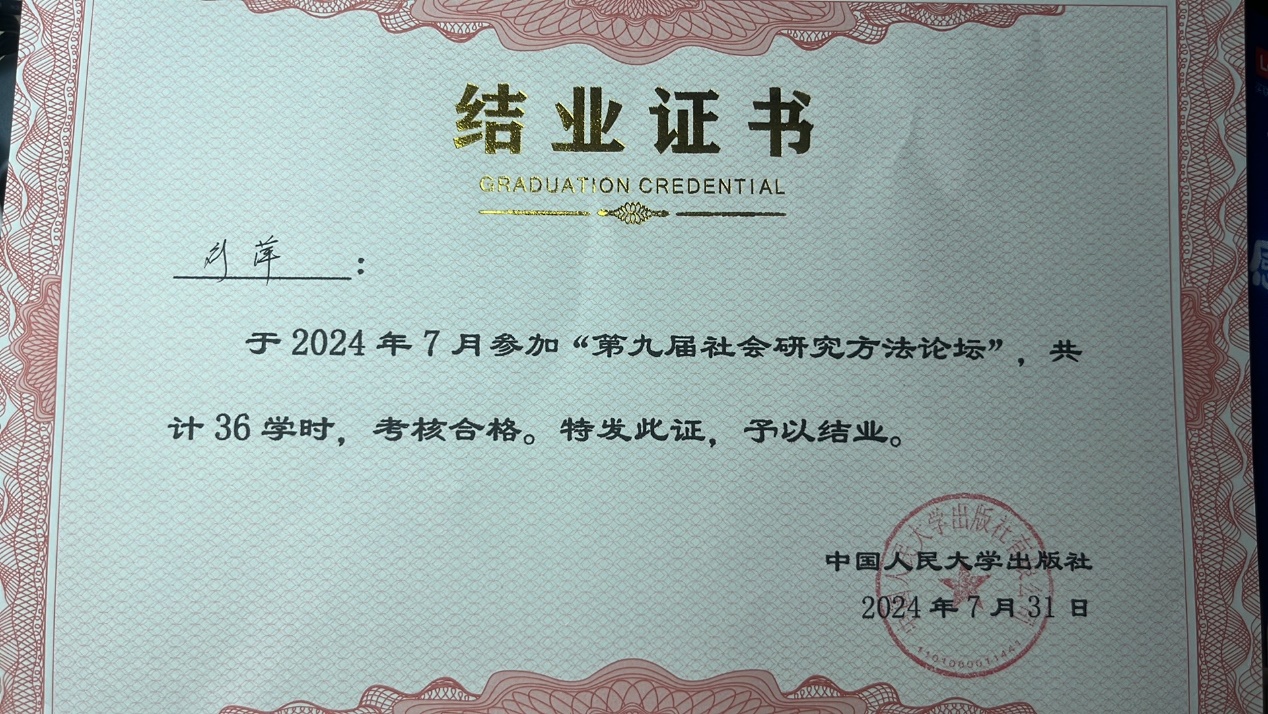 2024年7月28日至8月1日,中国人民大学出版社邀请国内社会研究方法领域的知名专家、学者,于贵州省贵阳市举办了“第九届社会研究方法论坛”。本次论坛共有来自全国来自28个省市,134所院校的240位老师和学生参加,其中线上参会72人。h视频 公共管理系刘萍老师全程参加了此次会议,积极参与互动,并获得了本次论坛的结业证书。社会研究方法作为发现社会、探究社会的利器,是社会科学研究的重要工具。国内高校 和科研机构对社会研究方法愈发依赖,尤其在新一代信息技术、人工智能快速发展的背景下, 如何面向新情况更好地开展社会研究,更成为广大科研工作者的重要关切。秉承“服务高等 教育事业,服务一线任课教师”的宗旨,为了进一步促进对社会研究方法的交流和研讨,提 升研究者运用社会研究方法的能力与技巧,人大出版社组织了此次论坛。本次会议议程及主讲人情况介绍如下:
