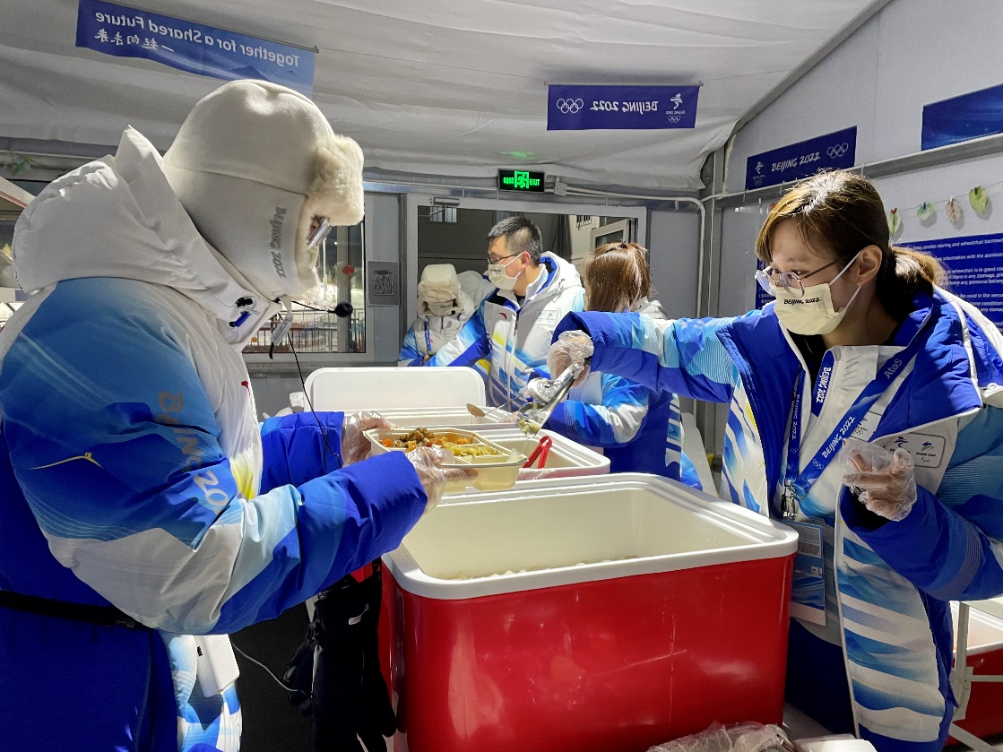 在完成自己本职工作之余,我也积极支援其他小组的工作。由于观众入场时客流量较大较密集,其他岗位的志愿者工作压力较大,我会积极协助运行支持团队的小伙伴们为观众发放冬奥会小旗子、墨镜等物资,并为有需要的观众提供信息咨询服务。另外,遇到一天接连两场比赛,志愿者们没有时间去餐厅就餐,需要分批次在场馆用餐的情况,我也会主动协助主管帮助大家打饭取餐,尽量保证赛事服务领域的每位志愿者都能吃到热乎乎的晚饭。