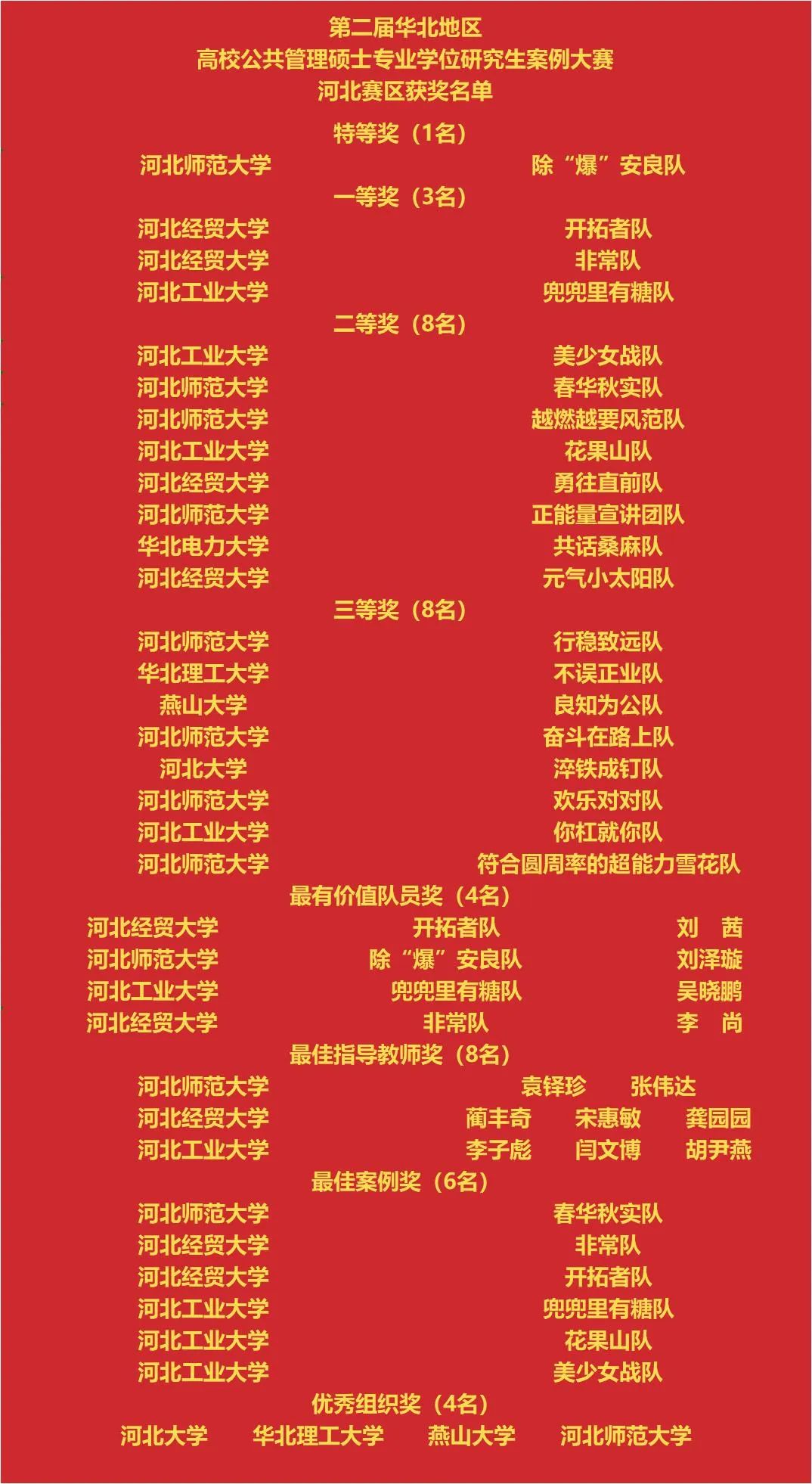2022年9月25日,第二届华北地区高校公共管理硕士专业学位研究生(MPA)案例大赛河北赛区预选赛决赛在天津举行。来自7家MPA培养单位的46支队伍经过激烈角逐,最终河北师范大学代表队荣获特等奖,h视频 、河北经贸大学等3支代表队获一等奖,h视频 等8支队伍获二等奖;河北大学等8支队伍获三等奖。大赛前11名获奖队将代表河北省参赛。