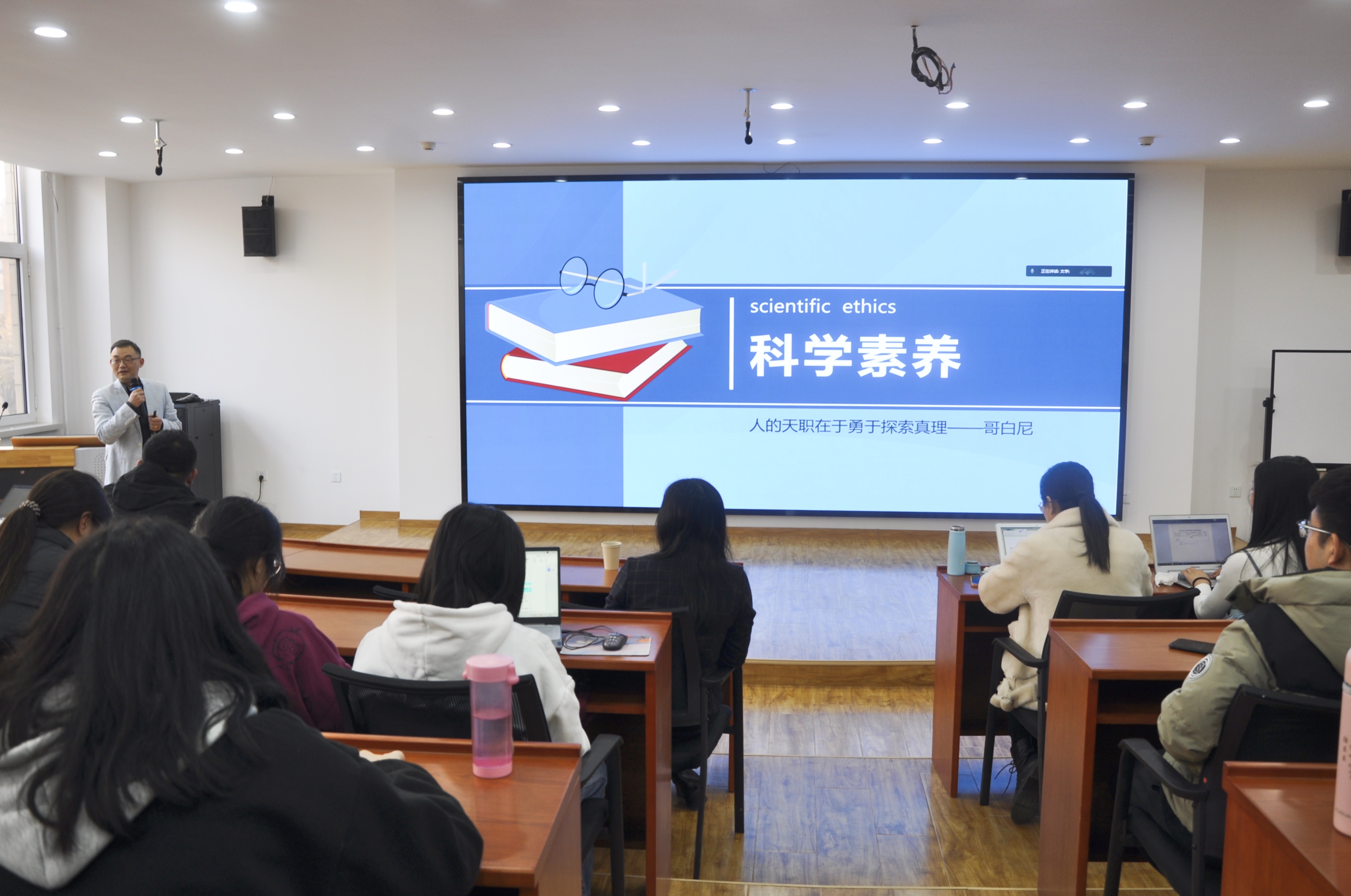 然后,胡校长又提到了科学素养的重要性,尤其是科学素养对于文科专业的重要价值:可以使文科研究生的知识面得到扩展,使研究建立在广博知识的基础上为日后走上工作岗位奠定良好基础;文科学生可以掌握科学的思维方法,引导学生领悟科学方法的思维特点掌握科学方法活的灵魂;可以培养文科学生的科学态度和高尚品德,科学素养的培养可帮助他们形成严谨、清晰的科学作风、敏锐细致的观察能力和逻辑分析等能力。