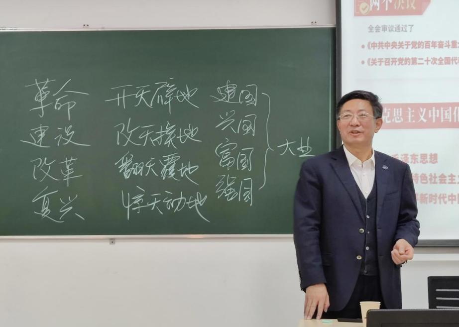 在解读“四个伟大成就”的时候,李书记和同学们一起用了“开天辟地”、“改天换地”、“翻天覆地”、“惊天动地”四个成语来概括四大成就对应的四个时期。