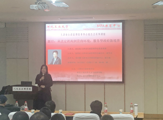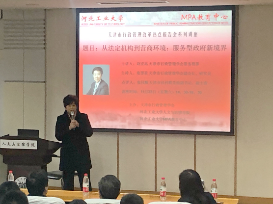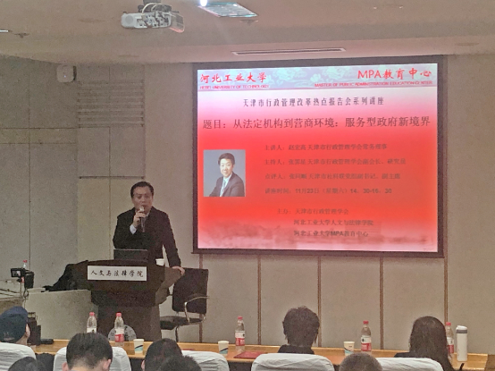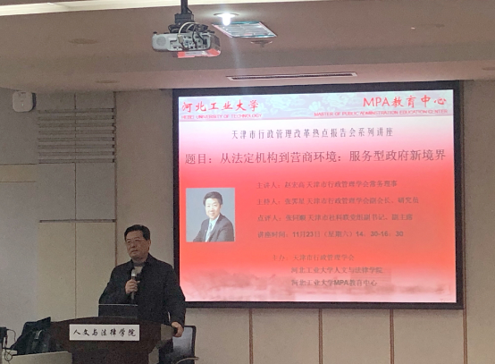 2019年11月23日,h视频 举办第九期“文法大讲堂”。诚邀天津市行政管理学会常务理事,滨海新区经开区法定机构改革小组成员、天津经济技术开发区政务服务中心(行政审批局)书记、局长赵宏高老师主讲以“从法定机构到营商环境:服务型政府新境界”为主题的报告会。讲座由天津市行政管理学会副会长、研究员张霁星老师主持,由天津市社科联党组副书记、副主席张同顺老师进行点评。文法学院师生认真聆听了本次讲座。