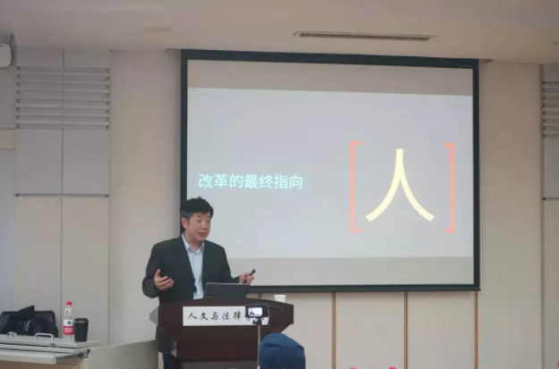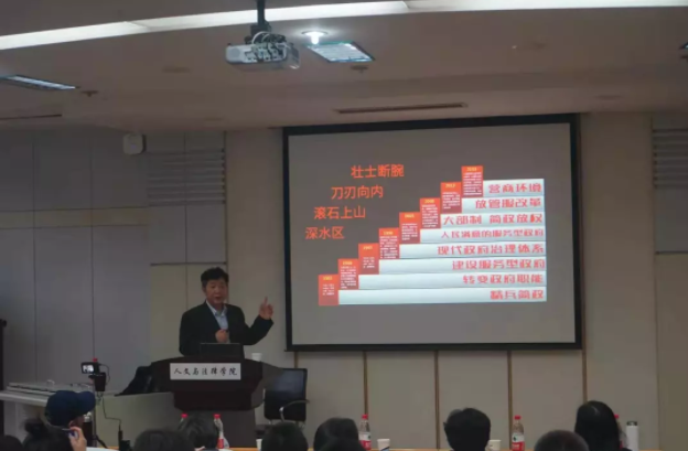 讲座正式开始。赵宏高老师从天津市滨海新区法定机构改革入手,先对法定机构改革这一刀刃向内的自我革命进行了背景分析,然后简单讲述了法定机构改革的目标、内容与过程,得出了 “改革的最终指向是人”这一重要结论。