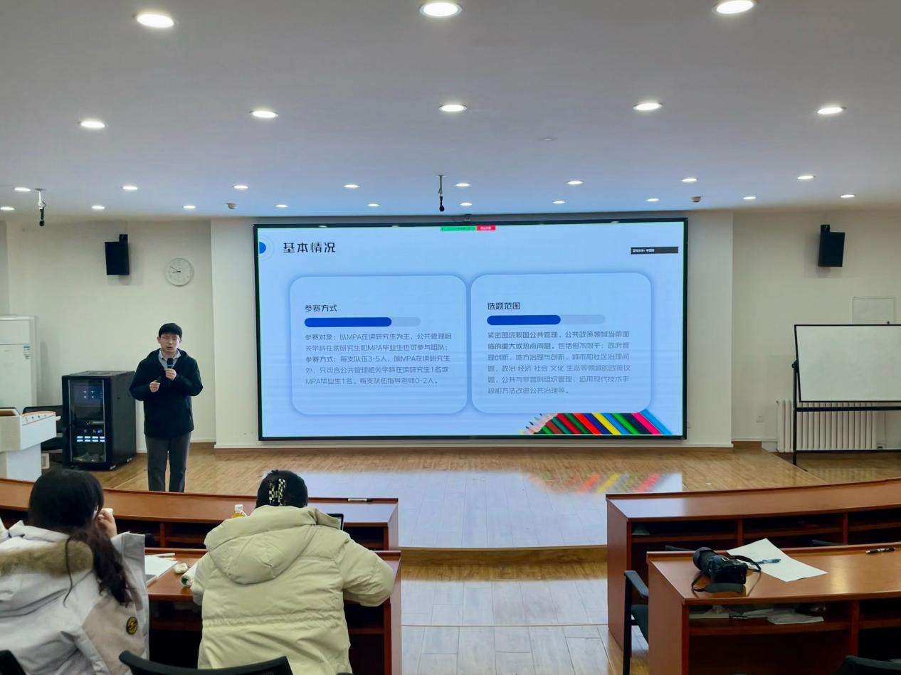 2023年12月11日晚,h视频 MPA教育中心于7C-208教室举办了第八届中国研究生公共管理案例大赛动员会,h视频 副院长闫文博、MPA教育中心副主任李亚鹏共同主持。