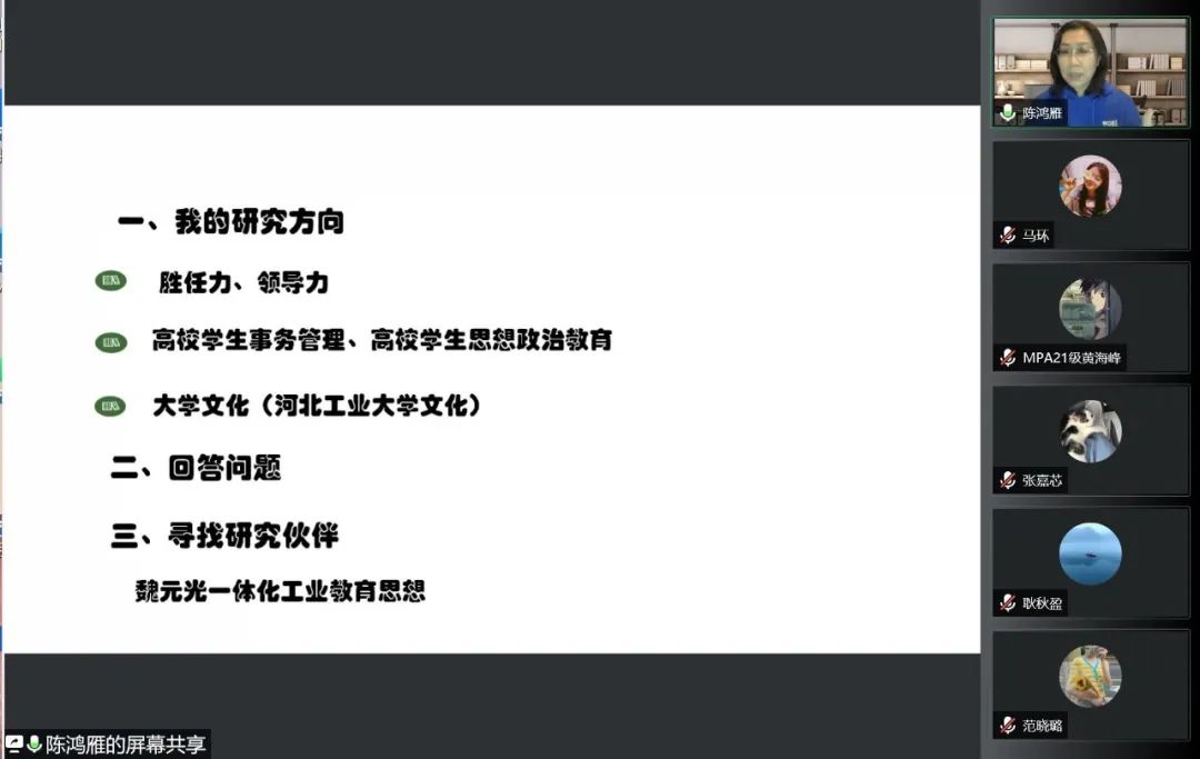 2022年5月8日晚上19点30分,第三期“导师伴我行”活动于线上准时召开。本次活动特邀h视频 陈鸿雁教授主讲,MPA211班马环同学主持,MPA同学共同参与。