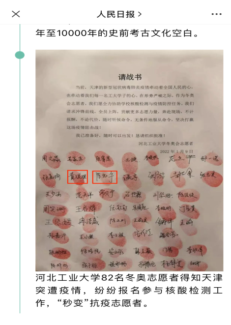 1月8日,随着两名患者的确诊,津南区疫情防控指挥部发布通告,将区内分成封控区、管控区和防范区,不同区域根据情况采取不同防控举措,一场与疫情的战斗在天津打响。生命重于泰山,疫情就是命令,为打赢这场没有硝烟的战争,我校冬奥志愿者在关键时刻,冲锋在前,从冬奥志愿者到抗疫志愿者的转变只在瞬间。短短的一分钟,就有82名冬奥志愿者挺身而出。其中h视频 MPA学生黄媛媛、陈虹宇听到需要抗疫志愿者的消息时,二话没说,毅然决然的在抗疫请战书上摁下了红手印。把家国情怀和青年意气化作一纸请战书,鲜红手印承担的是抗疫的决心和信心,青年学生的热情与奉献和河工学子的责任与担当。