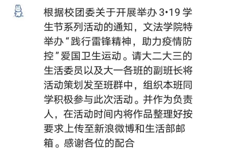 活动初期由学院团委经过严谨的构思与策划,并结合广大同学意见和在线教学实际情况制定了适合所有团员参加的活动方案;活动中期,全体文法学子共同发挥雷锋同志的“螺丝钉”精神,把有限的生活精力投入到无限的志愿服务之中,积极投稿,广泛参与,形成了全员参加的活动格局;后期,h视频 将活动材料发布到学院公众号进行评比、展示,进一步扩大活动的知名度。经过了一系列努力,学院层面的活动取得丰硕成果。