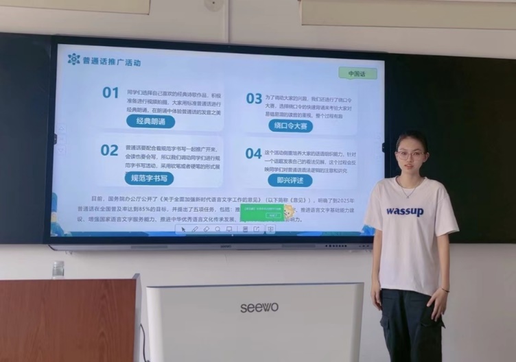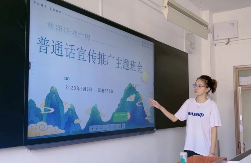 汉语222班在本次活动中,以立德树人为根本任务,服务筑牢中华民族共同体意识为主线,积极创新宣传形式,丰富宣传内容,通过线下开展推普主题班会,进行交流分享,线上进行字书写、经典诵读等活动,营造推广普通话的浓厚氛围,大大增强学生自觉规范使用国家通用文字和传承中华优秀传统文化的意识。