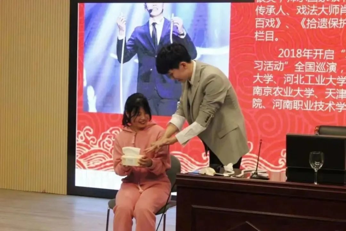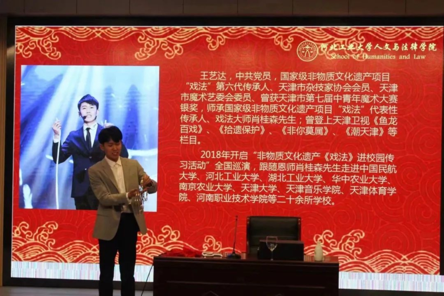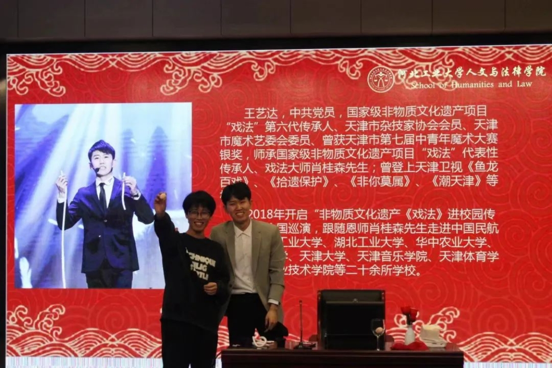 为使同学们深入了解古彩戏法的艺术魅力,认识到肩上所担负的传承非遗、延续传统文化的重任,增强我们的文化自信,在推动时代进步的同时让千年的中华文明经久不息、源远流长,h视频 中文系邀请到了国家级非物质文化遗产项目“戏法”第六代传承人、天津市杂技家协会会员、天津市魔术艺委会委员王艺达,于3月24日下午2点在h视频 红桥校区东院7D101为大家讲解戏法的历史起源、戏法的传承与发展现状、戏法与魔术的区别等古戏法相关的知识。