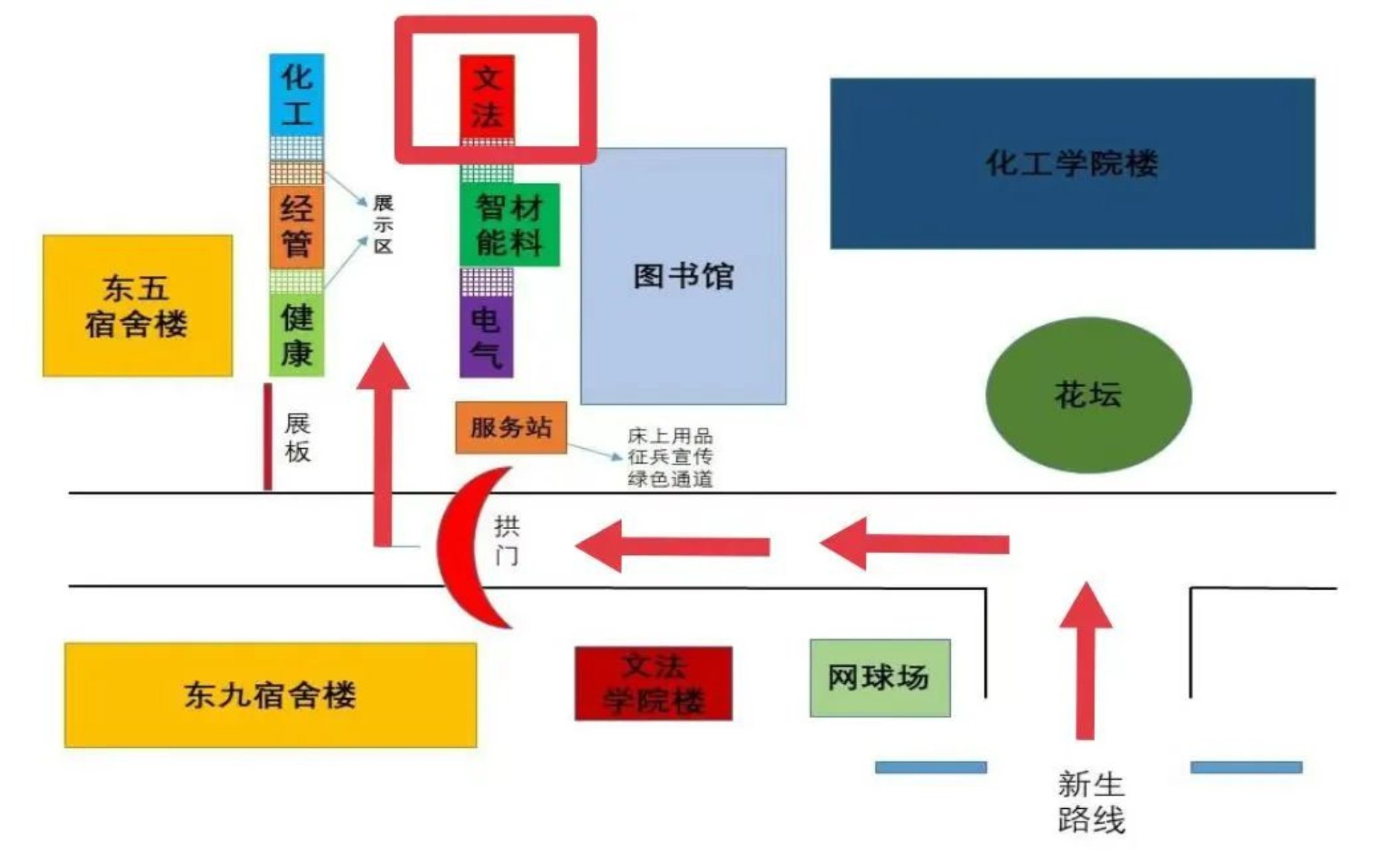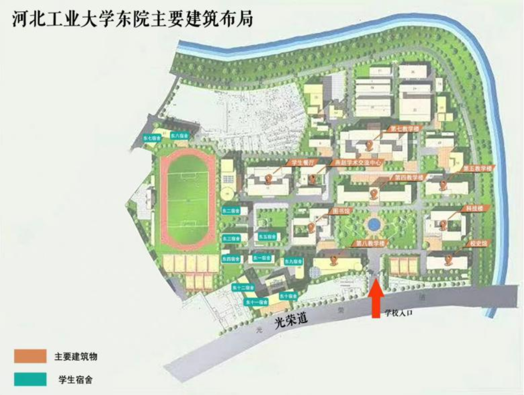 新生们进入东院校门口后,向左方向拐弯直走便可看到图书馆,随后到达位于图书馆西侧的报道点。新生女生宿舍是东二宿舍,新生男生宿舍是东三宿舍。报到路线图和h视频 东院主要建筑布局图如下所示。