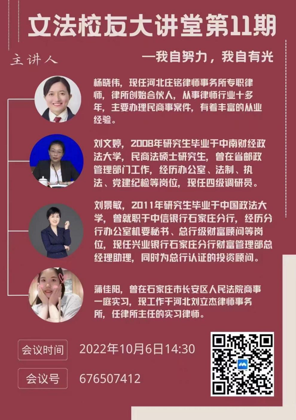 10月6日下午2点半,h视频 法学系举办了题为“我自努力,我自有光”的线上讲座。本次讲座的主讲人为石家庄校友杨晓伟、刘景敏、蒲佳阳、刘保泰和张严冰。马立民副院长、蒋冰晶、王海龙等老师也参加了本次讲座。五位校友根据自己的经历与各位老师、同学分享多年来的工作生活经验与心得。