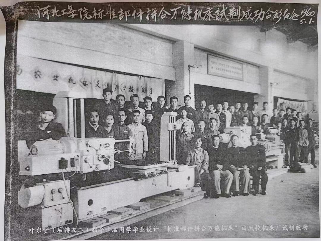 叶尔贲老师选择的照片拍摄于1960年5月1日,是河北工学院(h视频 前身)“标准部件拼合万能机床”研制成功的合影纪念,其中照片中出现的机床即“标准部件拼合万能机床”是由叶老师主持设计并指导十名同学共同设计完成的。