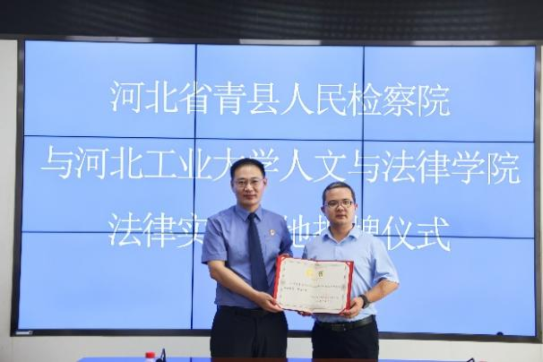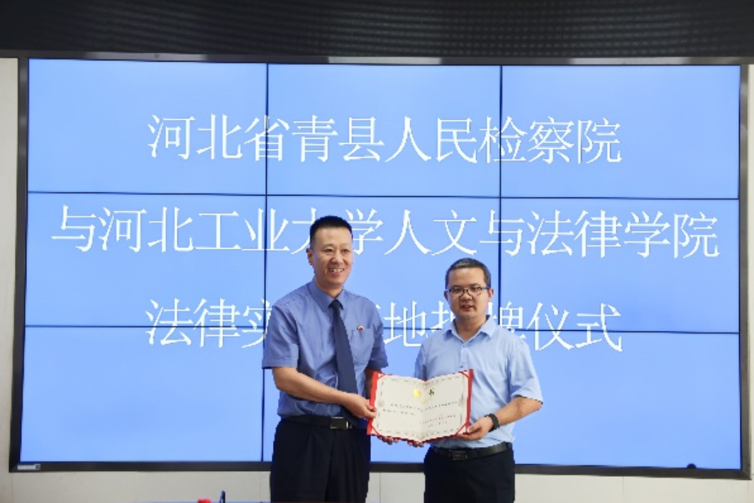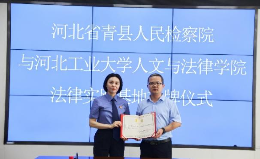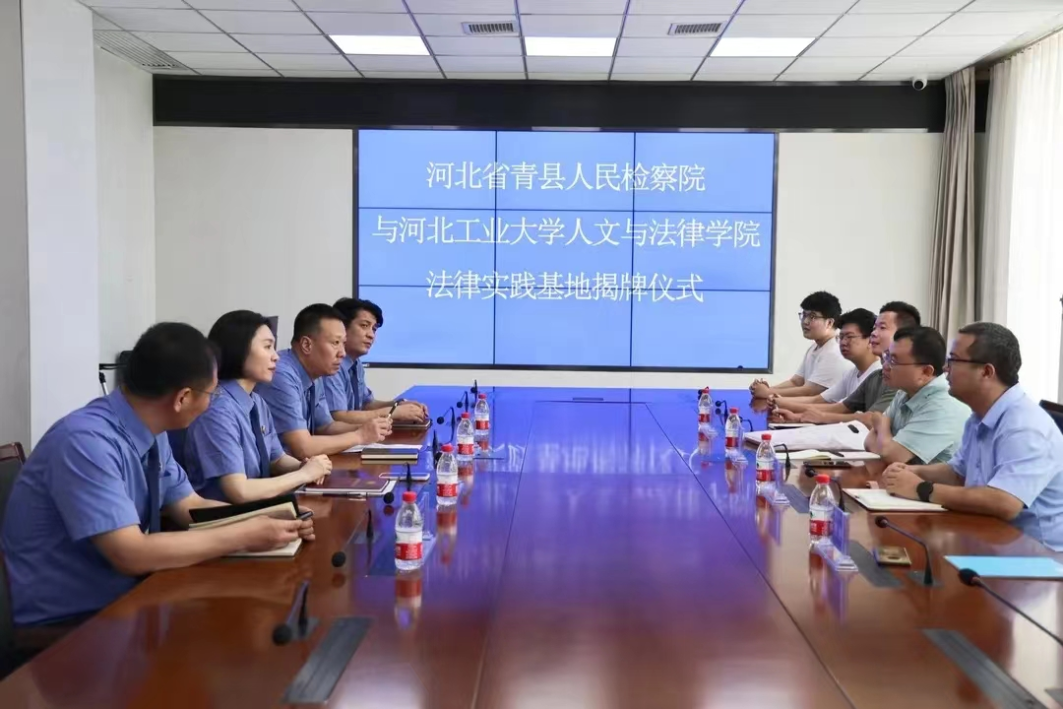 为深入贯彻落实习近平法治思想,进一步深化检校合作,有效推动法学教学研究与司法实践有机融合,提高法律人才培养质量和司法实务工作水平,2023年7月11日上午10点,h视频 与河北省青县人民检察院法律实践基地揭牌仪式在青县人民检察院顺利举行。河北省青县人民检察院检察长董晓玲、常务副检察长戴利华、副检察长张忠臣、政治部主任姚亮、h视频 副院长闫文博、法硕教育中心副主任李燕涛、法学系党支部书记李飞出席仪式。会议由青县人民检察院副检察长戴利华主持。