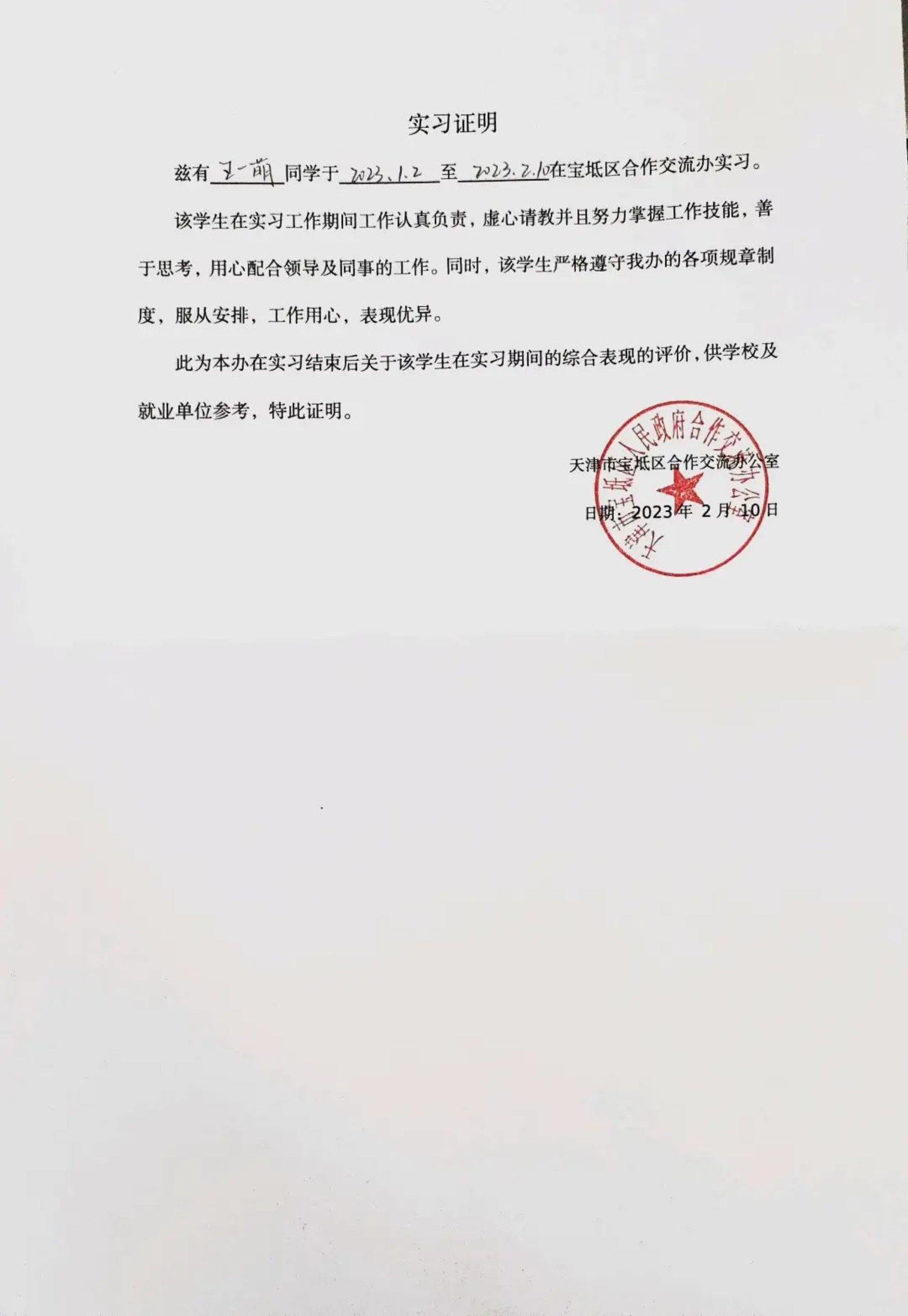 2022年寒假天津市大学生实习“扬帆计划”政务专项工作在各团区委、各高校团委、各用人单位和实习生的共同努力下圆满结束。经过各单位组织申报、考察审核等环节,h视频 法学204班学生王一萌同学荣获“优秀实习生”称号。