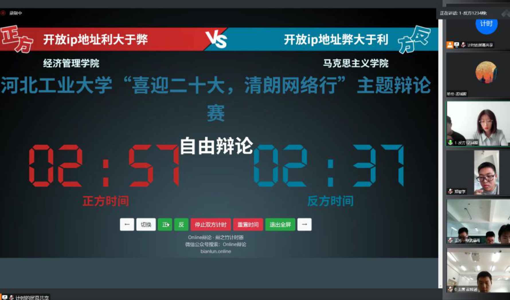 10月8日,h视频 “喜迎二十大,清朗网络行”主题辩论赛第一轮在线上——腾讯会议成功举行。比赛共有6场,场场精彩绝伦,各学院辩手在比赛中碰撞思维,为自己学院而战。