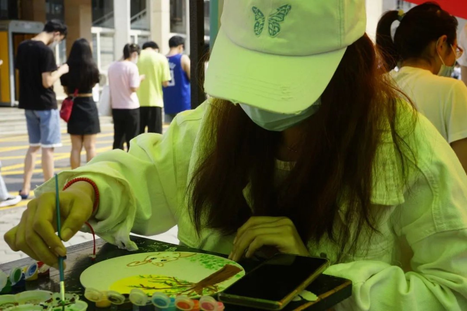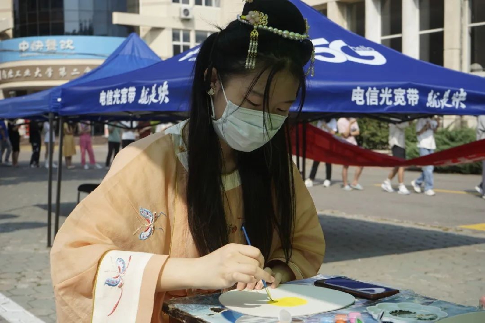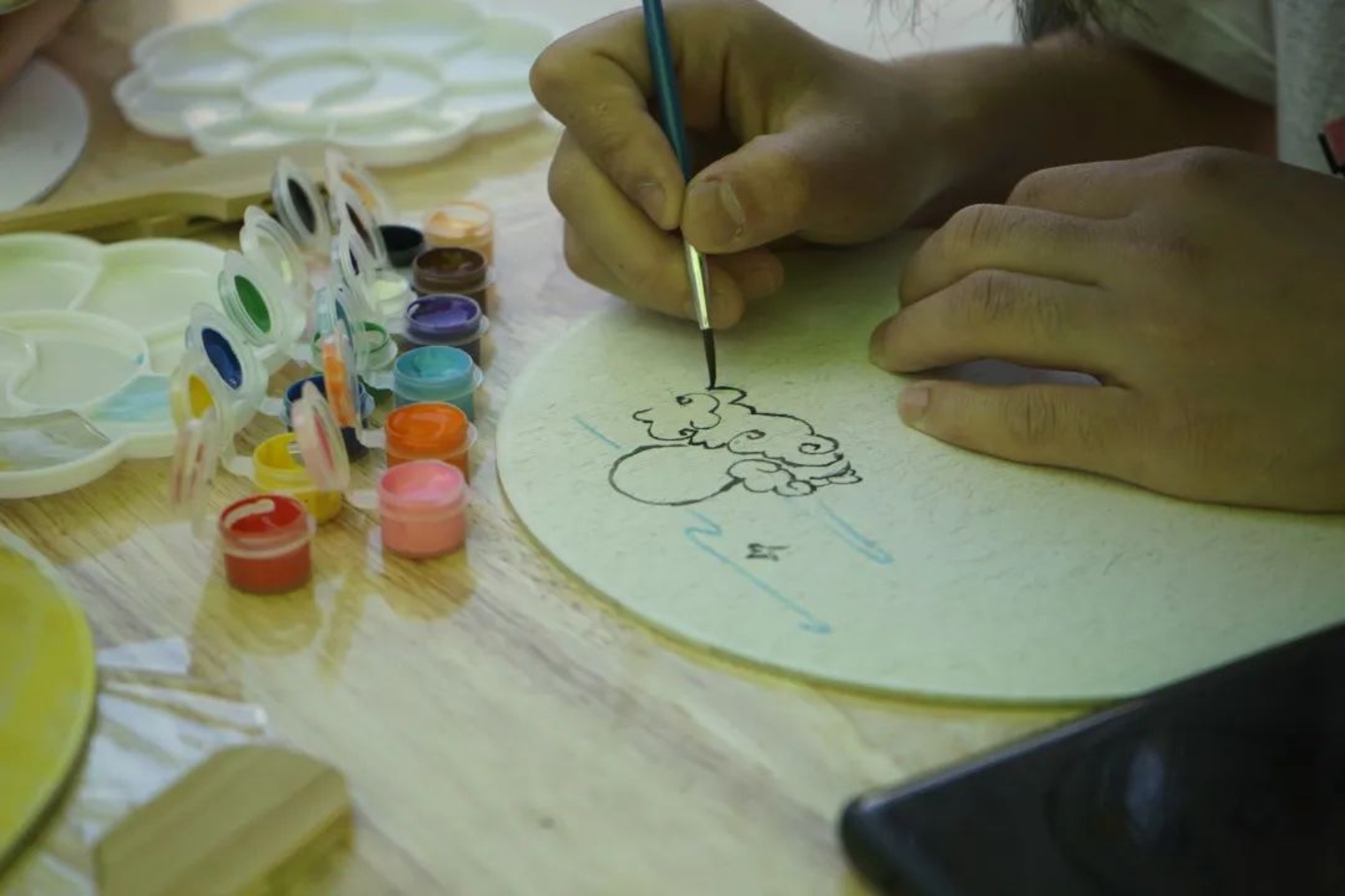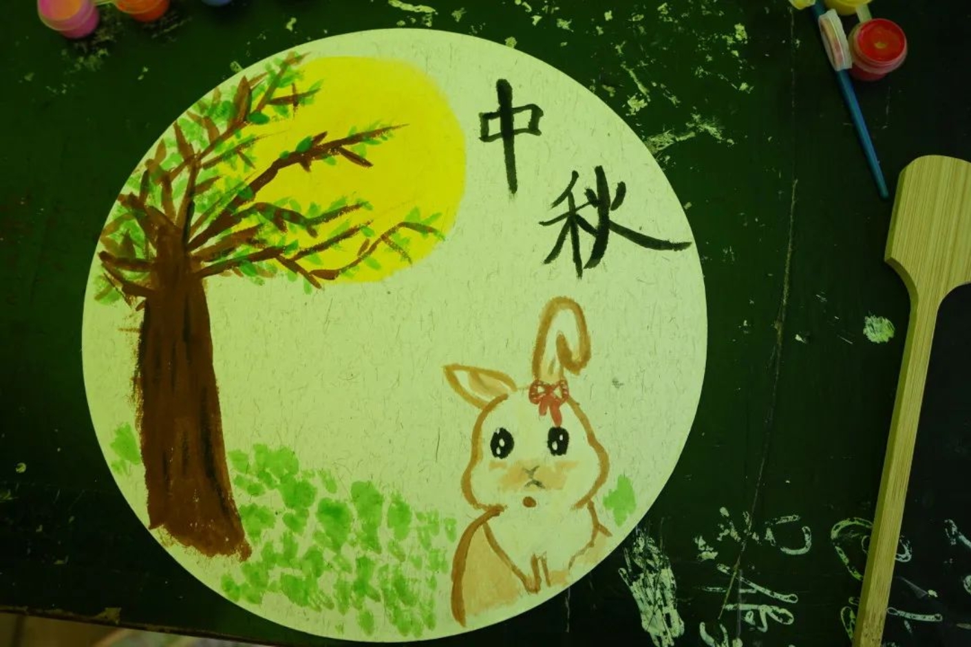 在活动过程中,同学们自己构思设计,用工具在扇面上进行绘画。学生们既秉持传统,又张扬个性,在短短的时间内,创作出一把把风格迥异的团扇,有的扇面展现着古典的清新淡雅,有的扇面展现着现代的绚丽多彩……一把把象征团圆与思念的美丽团扇就这样在学生手中诞生了,艺术之花在扇面上竞相绽放,素面团扇上绘出学生们心中的中秋诗意之美。