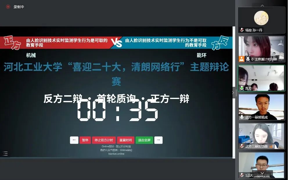 10月16日上午8点30分,h视频 “喜迎二十大,清朗网络行”主题辩论赛第二轮在线上——腾讯会议成功举办。比赛共有3轮,辩手们唇枪舌战,雄辩滔滔。