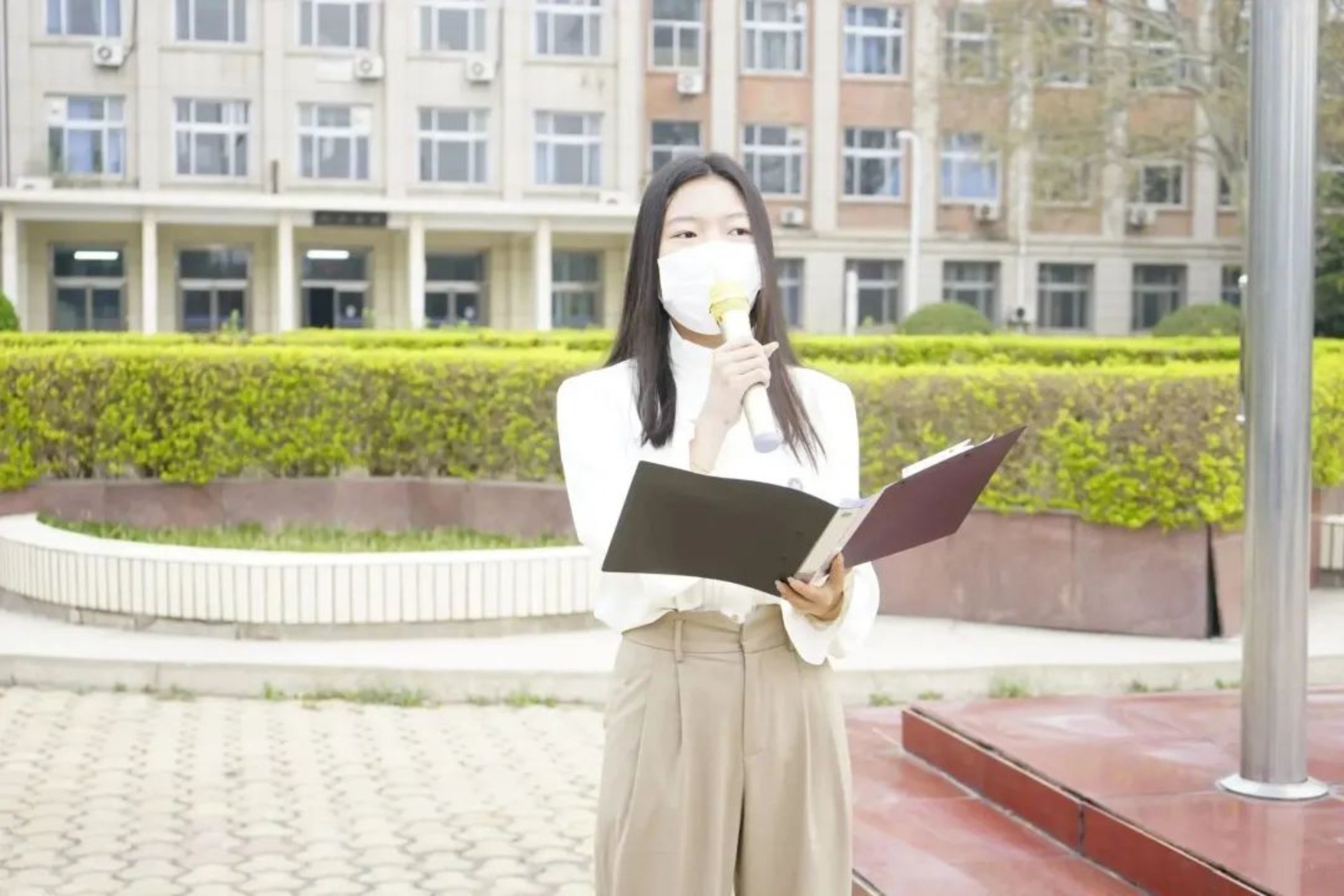 接下来学生代表公管222班姜一涵同学上台演讲。她首先回忆往昔,讲述在那个血雨腥风、金戈铁马的时代是革命先烈为民族独立和国家尊严而誓死抗敌献出了宝贵的生命;为彻底埋葬旧世界,建立社会主义新中国而前赴后继、英勇作战,抛头颅、洒热血。又是一年清明时,又到一年英雄祭。那一个个把生死置之度外的烈士,那些在战场上拼死杀敌的身影,岁月和人民没有忘记。