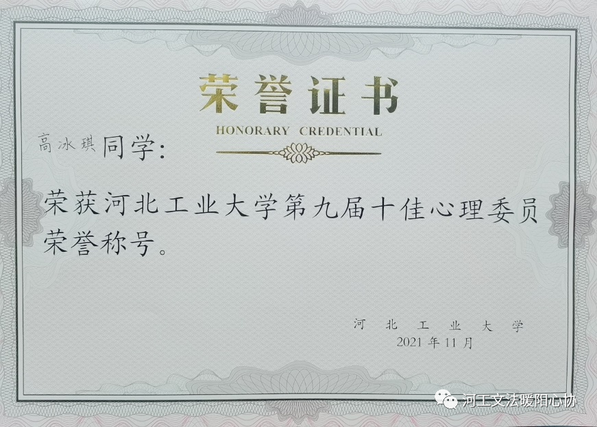 在“h视频 第九届十佳心理委员”评选活动中,高冰琪同学以其丰富的经历、饱满的工作热情脱颖而出,荣获“h视频 十佳心委”称号。