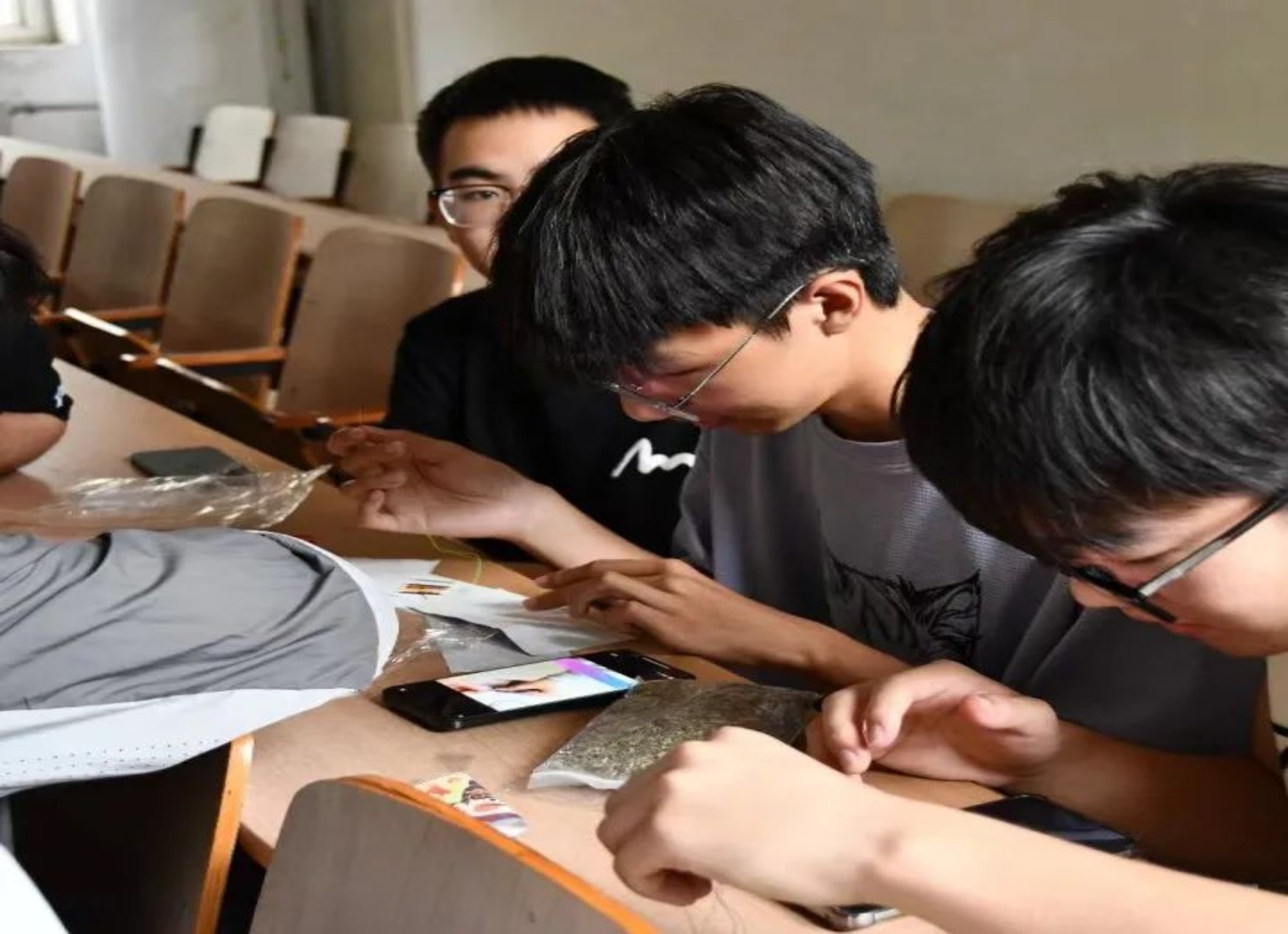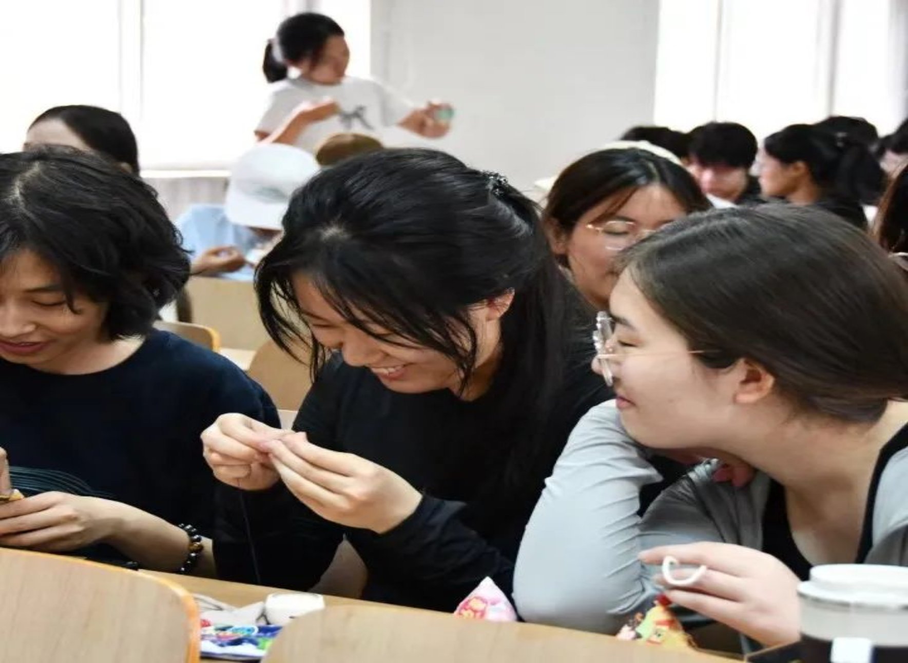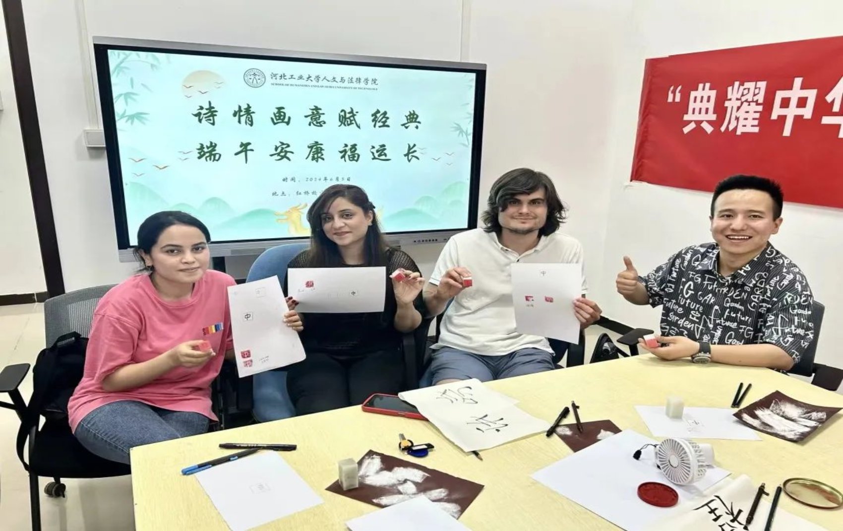 篆刻组的同学们操作着篆刻刀在印石上徐徐切下,往前运行,时提时按,积点成线,大家在篆刻中体会到方寸之间文字与技法的美。国际学院的留学生同学们也来到了活动的现场,亲手体验中华篆刻文化,学习在石头上创作独特的篆刻作品,被中华优秀传统文化深深吸引,兴致盎然地与其他同学一同探讨端午节的习俗,了解源远流长的端午文化。