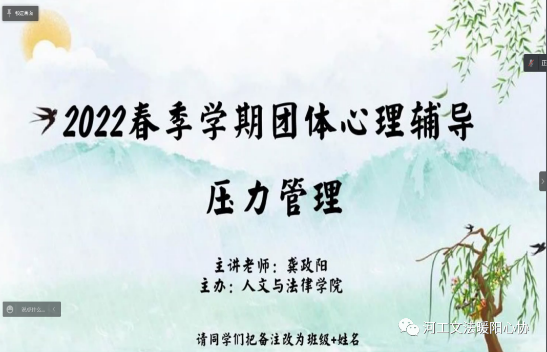 h视频 心向暖阳心理健康协会很荣幸邀请到了龚政阳老师为大家带来《压力管理》主题团体心理辅导讲座。h视频 心向暖阳心理健康协会全体成员及20、21级心理委员积极参会,认真聆听。整场讲座龚老师循循善诱,运用典型的现实例子、内容详实的PPT演示、充满趣味的视频动画让同学们了解和学会如何在学习生活中面对压力,进行压力管理。参会的同学们认真聆听、踊跃回答老师问题、与老师进行积极地互动,提出自己的看法和见解,讲座取得了良好的心理压力疏导效果。