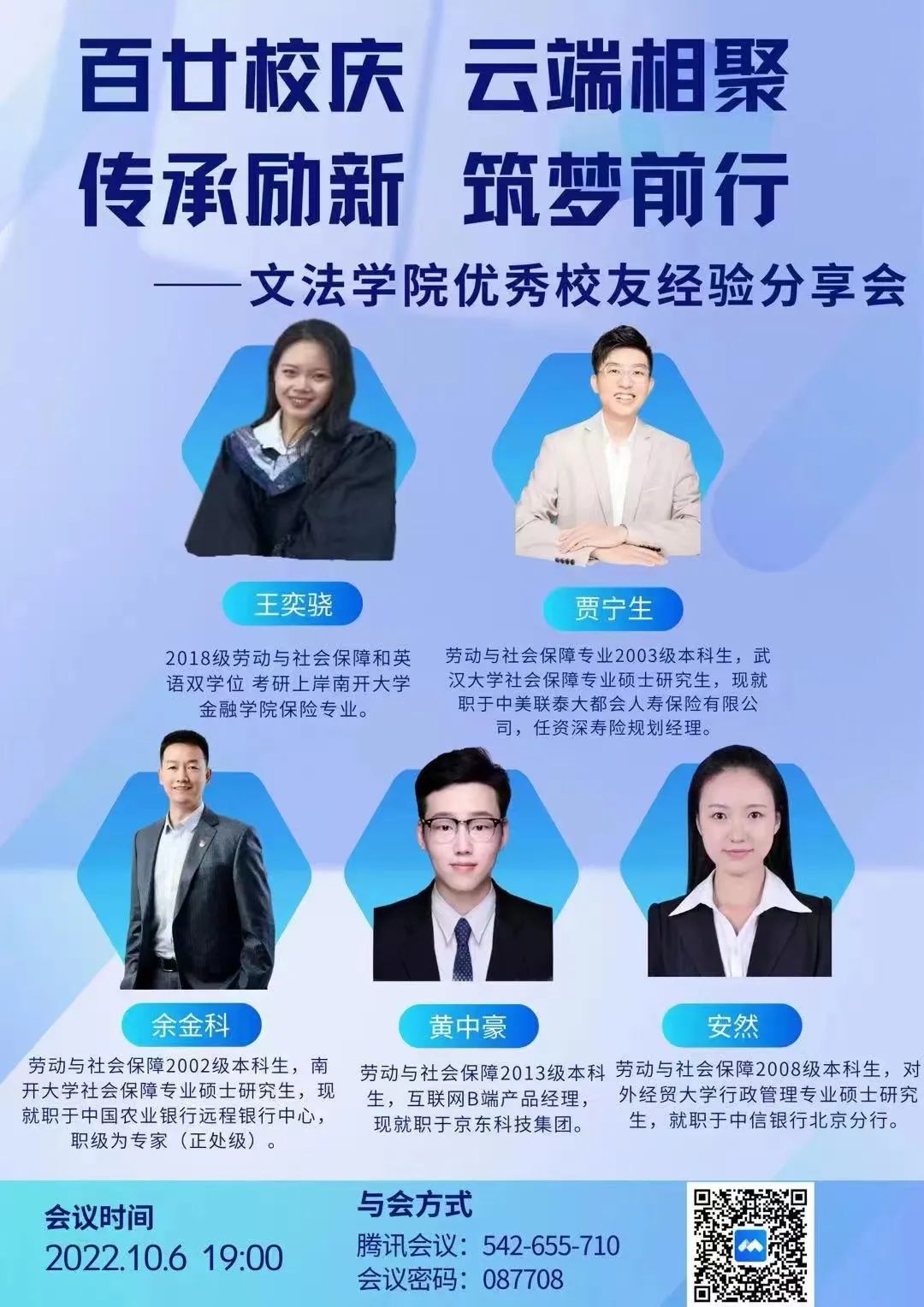 10月6日晚7点,h视频 特邀考研上岸南开大学金融学院保险专业的王奕骁、现就职于中美联泰大都会人寿保险有限公司的贾宁生、现就职于中国农业银行远程银行中心的余金科、现就职于京东科技集团的黄中豪和现就职于中信银行北京分行的安然这六位优秀校友分享自己的经验。文法学院党委书记白彦刚、院长李艳双、副院长马立民和闫文博及h视频 多名教师和社保本科学生参加此次讲座。