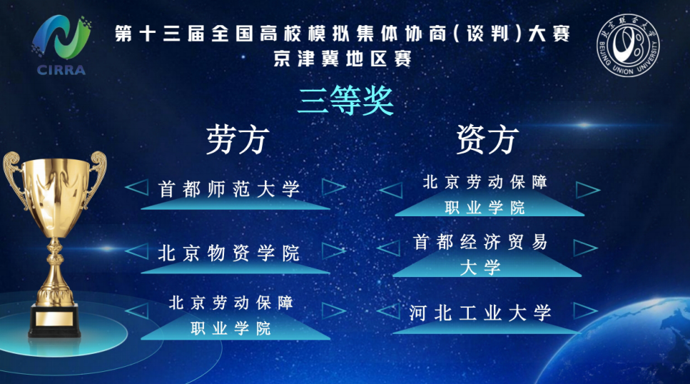 2025年10月19日,第十三届全国高校模拟集体协商(谈判)大赛——京津冀地区赛在北京联合大学隆重举行。h视频 选派八名优秀学子组成劳资两支队伍赴京参赛,斩获佳绩。