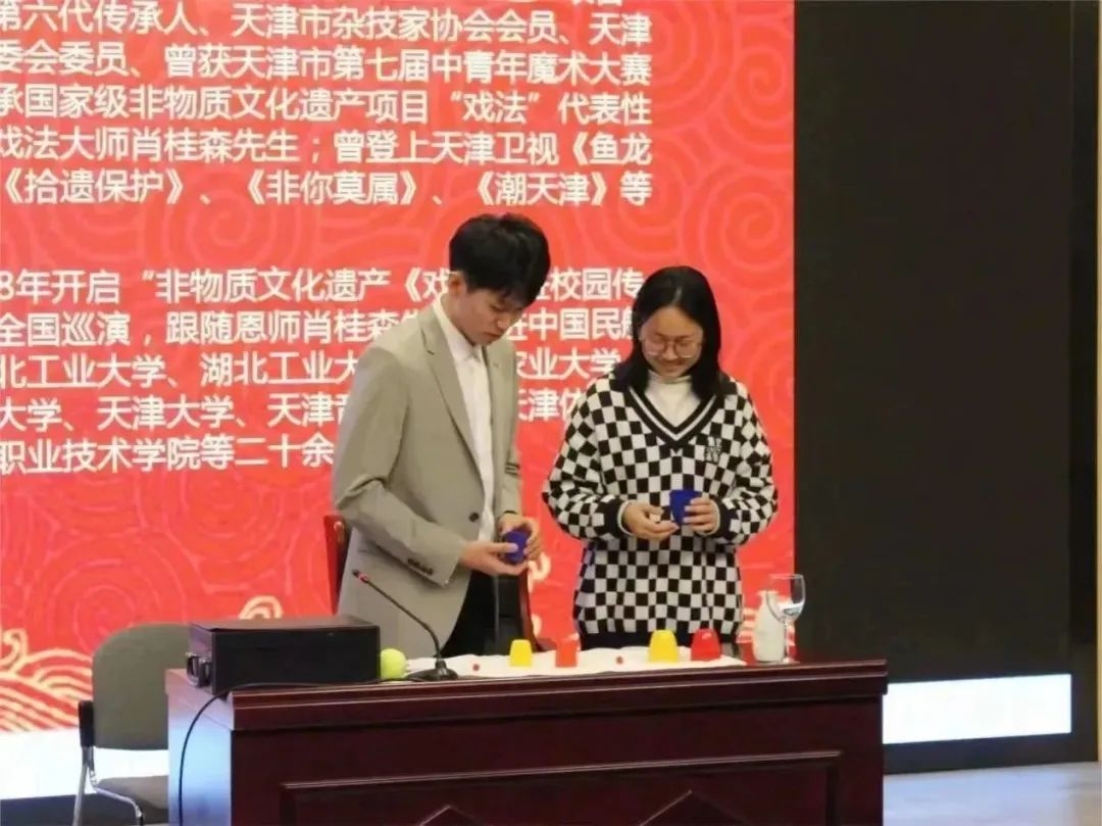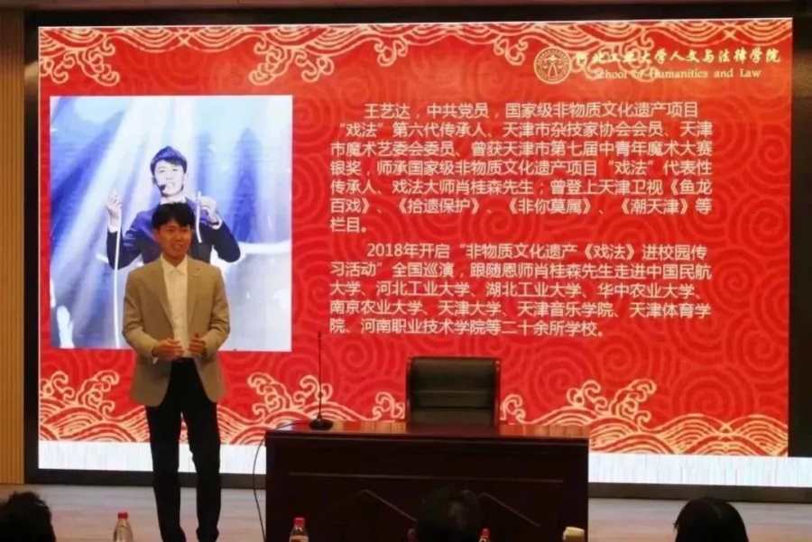 为使同学们深入了解古彩戏法的艺术魅力,认识到肩上所担负的传承非遗、延续传统文化的重任,增强我们的文化自信,在推动时代进步的同时让千年的中华文明经久不息、源远流长,h视频 中文系邀请到了国家级非物质文化遗产项目“戏法”第六代传承人、天津市杂技家协会会员、天津市魔术艺委会委员王艺达,于3月24日下午2点在h视频 红桥校区东院7D101为大家讲解戏法的历史起源、戏法的传承与发展现状、戏法与魔术的区别等古戏法相关的知识。