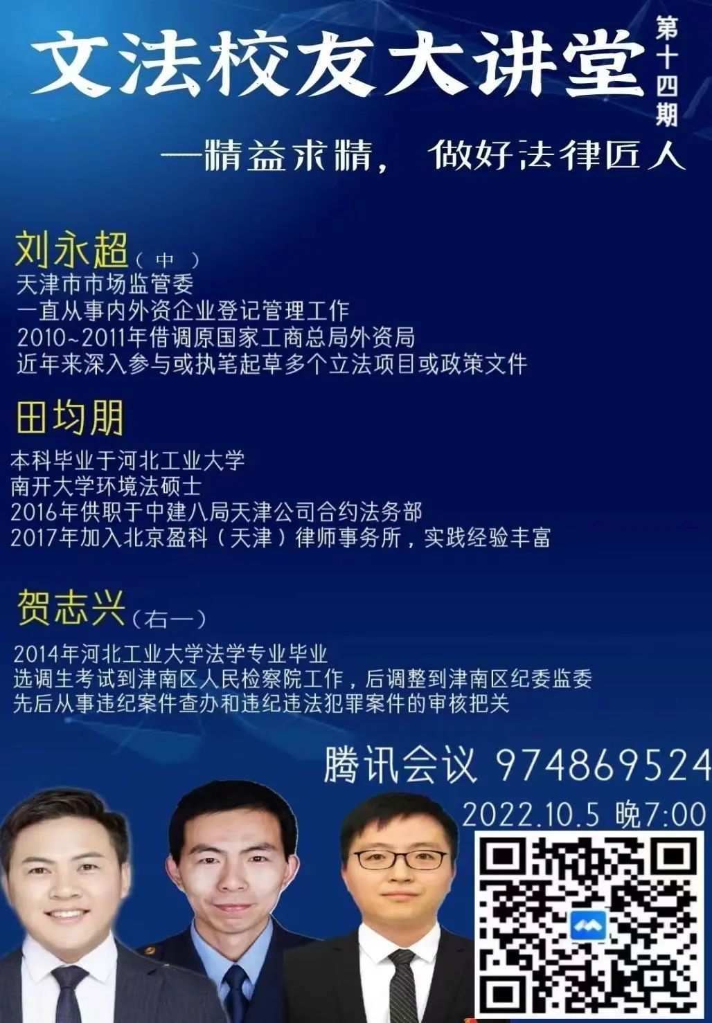 10月5日晚上7点,h视频 举办了题为“精益求精,做好法律匠人”的线上讲座。本次讲座的主讲人为我校法学专业三名优秀校友刘永超、田均朋和贺志兴。h视频 副院长马立民、副院长闫文博,李跃利、任红梅、蒋冰晶等老师和全体法学本科学生,以及天津、北京、石家庄等地部分校友参加本次讲座。