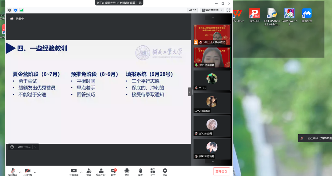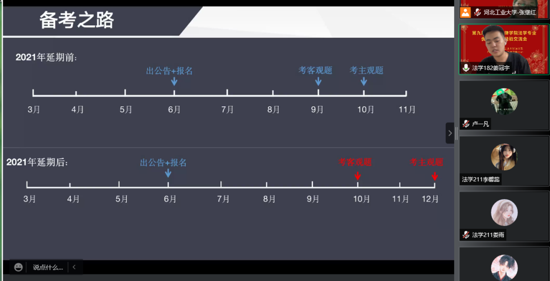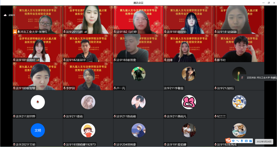 5月26日下午7点,第九届h视频 法学系优秀毕业生经验交流会顺利举办。本次经验交流会由h视频 法学系主办,法律服务中心承办,通过线上直播的方式进行。参与交流的有12位来自2017、2018级优秀的学长学姐,法学系的张继红老师担任本次交流会的指导老师。