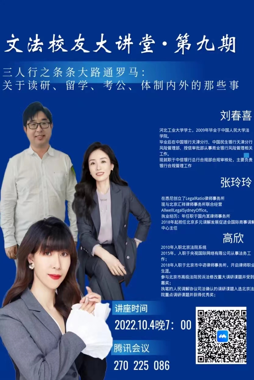 10月4日晚上7点,h视频 法学系举办了题为《三人行之条条大路通罗马——关于读研、留学、考公、体制内外的那些事儿》的线上讲座。本次讲座的主讲人为我校法学专业三名优秀校友张玲玲、高欣和刘春喜。h视频 院长李艳双,副院长马立民、闫文博及h视频 多名教师和全体法学本科学生,以及天津、北京、石家庄等地部分校友参与讲座。