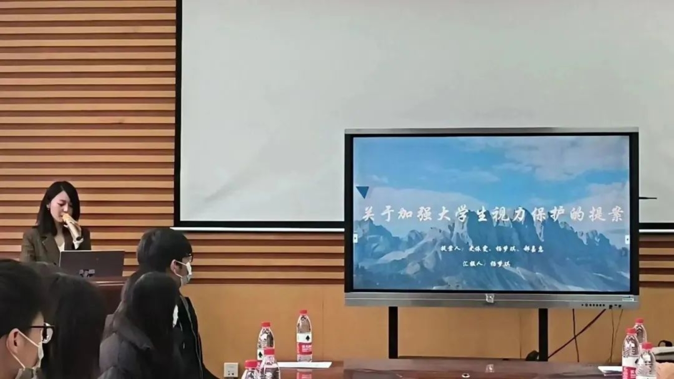 接着,主持人向大家播放了科普短片,短片通过生动的动画向我们展现政协的作用以及提案的相关信息。随后,提案组成员进行了“关于大学生视力保护提案”、“关于推进我校女大学生免费接种HPV疫苗提案”、“关于切实推行快递包装有效回收提案”和“关于校园空瓶回收提案”的集中展示:“关于大学生视力保护提案”从我国大学生近视率近年来不断上升的现状开始,通过展示具体的数据,向我们阐明了问题的重要性;“关于推进我校女大学生免费接种HPV疫苗提案”从对HPV疫苗的介绍开始,介绍了中国HPV疫苗的行业发展状况,由此提出了接种HPV疫苗是现实所趋,民心所向的问题,最后提出了推动适龄女孩HPV疫苗免费接种建议;“关于切实推行快递包装有效回收提案”从快递包装会对环境产生污染的现象出发,认真分析了快递包装产生污染的原因与背景,并在最后提出了具体的奖惩机制、实施方式以及监督机制,这为校园实践该提案提供了明确的指导;“关于校园空瓶回收提案”从社会现象出发,揭露了塑料瓶资源浪费的现状,以及校园内废弃饮料瓶的现象,随后从需求、环保意识和客观设施缺失等方面分析了现象发生原因,接着针对相关原因,提出了具体的建议和解决措施,提出环保积分、智能回收机器等创新类概念。