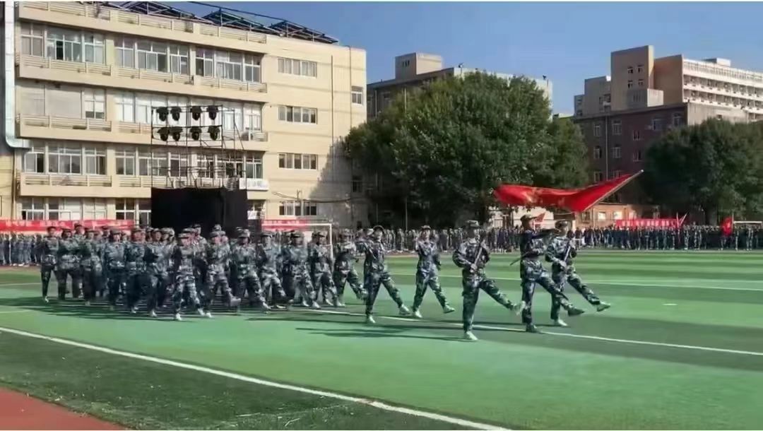 文法学院的三个方阵,共七个班级依次通过主席台,展示队列分列式。文法学子步伐统一,口号嘹亮,气势如虹,在义勇军进行曲的节奏下,正步、齐步衔接自如。身着迷彩,整装待发,是他们的坚毅与挺拔;句句口号,铿锵有力,是青春的拼搏与无畏。经历了灼灼烈日下的坚持,当他们齐摆头接受检阅时,那一枚枚坚定的目光透露出由内而外的自信与誓要捍卫中华的底气。红旗下的句句誓言不是空话,而是拳拳赤子心中火红的报国之花在迎风绽放。