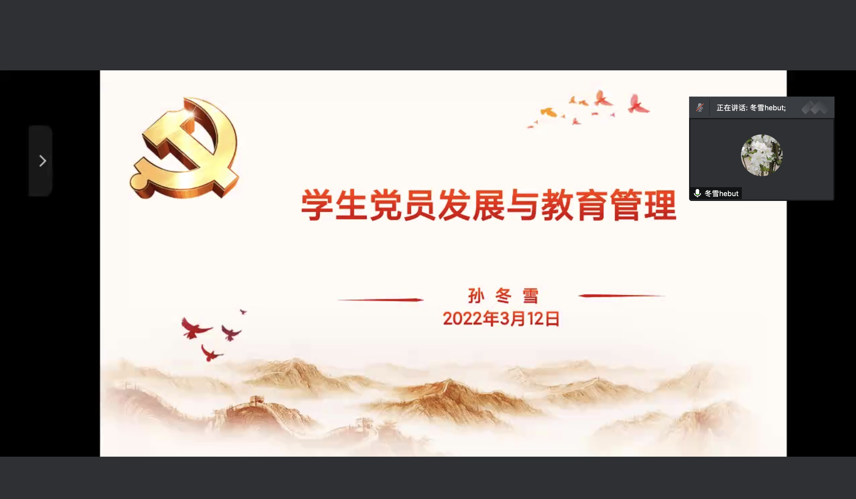 (图文来源 汉语182班纪文馨)为提升学院学生党员骨干的业务操作能力,推进学院学生党支部建设, 3月12日下午,学院邀请组织部孙冬雪老师在线上为h视频 学生党支部开展业务培训。此次培训会由许彦老师主持,学院党委副书记李彦磊书记、全体学生党支部书记及支部委员参加会议。