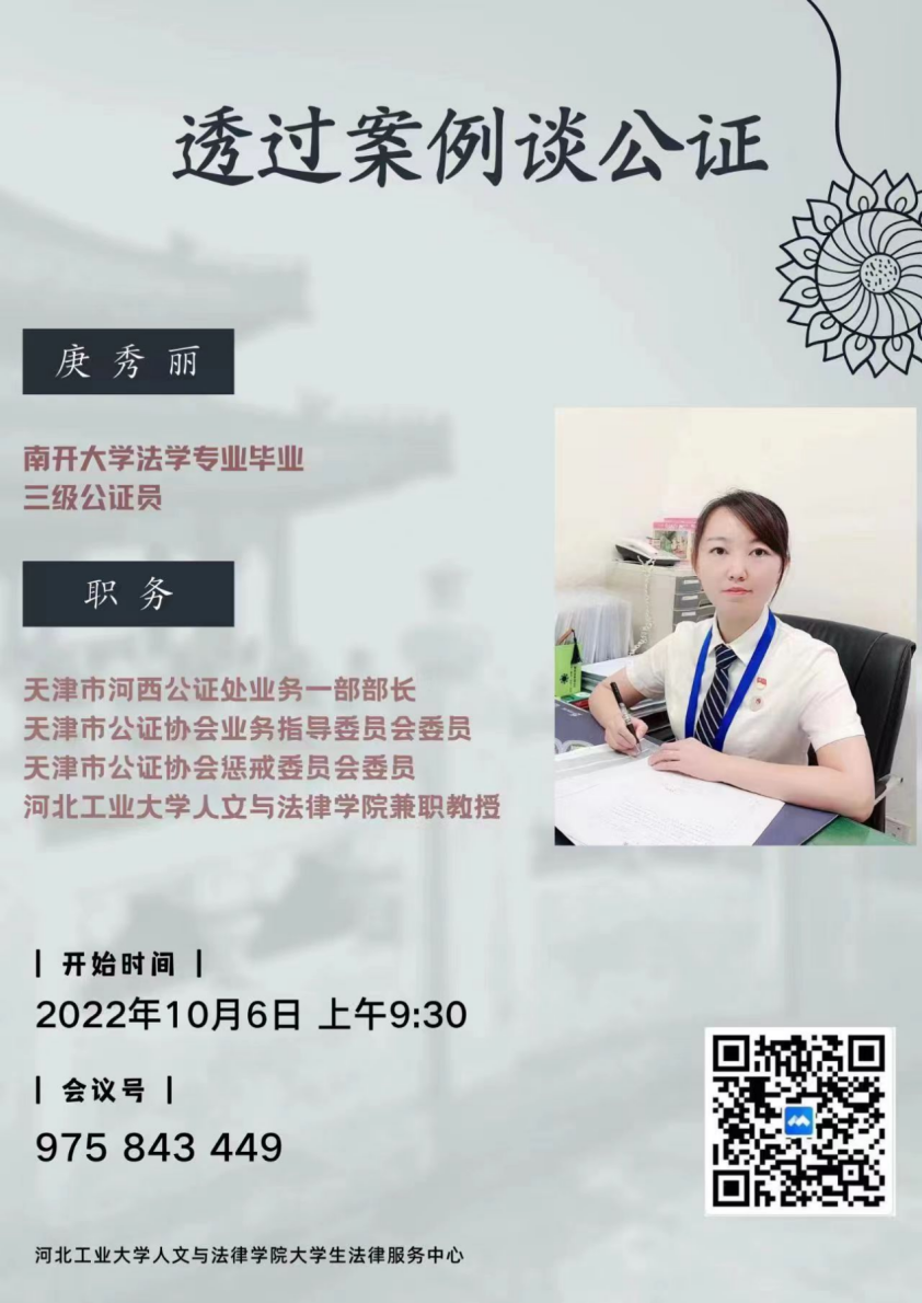 10月6日上午,天津市河西公证处庚秀丽公证员做客文法学院。庚秀丽公证员担任天津市河西公证处业务一部部长、天津市公证协会业务指导委员会委员、天津市公证协会惩戒委员会委员以及h视频 兼职教授,为在校大学生做了题为“透过案例谈公证”的线上讲座,详细讲述关于公证的方方面面。蒋冰晶、李飞等老师和全体法学专业学生参与了本次讲座。