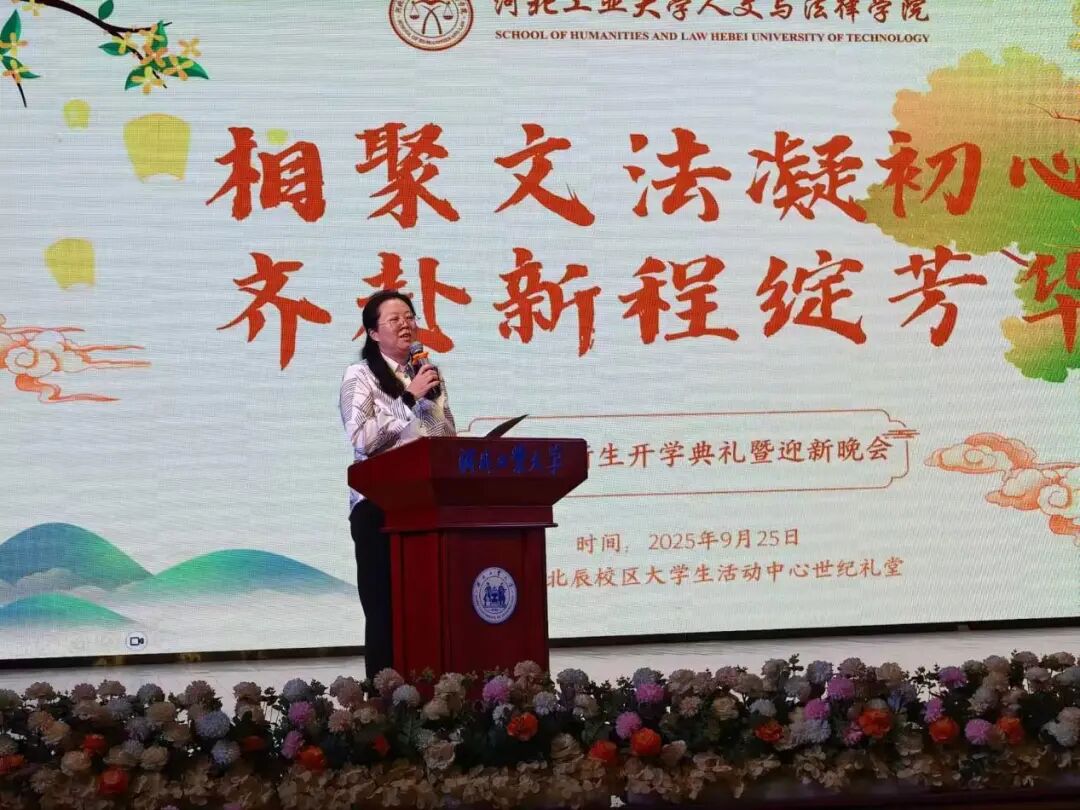 典礼伊始,h视频 院长蒋冰晶作迎新致辞,向加入文法学院的新同学们表示热烈欢迎,并围绕四点期望展开寄语:一是胸怀家国天下,将个人理想融入时代脉搏,以青春力量服务社会发展;二是永葆好奇心与求知欲,既要在课堂上与老师碰撞出思想的火花,又要在社团活动中绽放自我的光彩,“纸上得来终觉浅,绝知此事要躬行”,蒋院长以此勉励同学们要在实践中探索真知、锤炼品格;三是常怀感恩之心,铭记父母的养育之恩和老师的谆谆教诲,珍惜同窗之谊,不负韶华时光;四是涵养乐观豁达的胸襟,以从容之态应对挑战,于磨砺中凝聚奋进之力。最后,蒋院长衷心祝愿文法学院的同学们能够秉承“勤慎公忠”的校训,在人文底蕴与法治精神的滋养下,成长为有温度、有筋骨、有担当的时代新人,在河北工大的热土上放飞青春梦想!