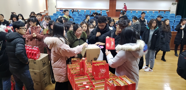 为全面推进学院精准资助和资助育人工作,确保家庭经济困难学生应助尽助,帮助家庭经济困难学生温暖回家,2019年1月9日下午4点,学院在大学生活动中心举办了“携爱回家”爱心大礼包发放活动,为全院232名家庭经济困难学生发放上鼠标、U盘、洗衣液等生活和学习用品,并给每个同学准备了一幅春联,请同学们把学院对于学生家庭的祝福一并带回家。h视频 学生工作组全体老师都参加了此次活动,亲手把学院对学生们的关爱送给他们。活动伊始,学院负责学生资助工作的沈飞老师对此次活动的目的及意义进行了说明,希望学生们在寒假来临之际,带着学院对于家庭经济困难学生的关爱回家,同时鼓励同学们在逆境中更要自强不息,拼搏进取。然后发放活动有序进行,发放过程中,各年级辅导员都表达了对同学们的殷切希望,希望同学们都能心向希望,乐观向上,用知识改变命运,用毅力战胜困难,同时愿这份关爱能够温暖他们的心灵,并请同学们把学院对于他们家庭的新年祝福一并带回家。同学们在领取大礼包的过程中笑容洋溢,满怀对学院及老师的感激,同时明白自己要更加拼搏奋进,不辜负老师与家长的期盼和厚望。