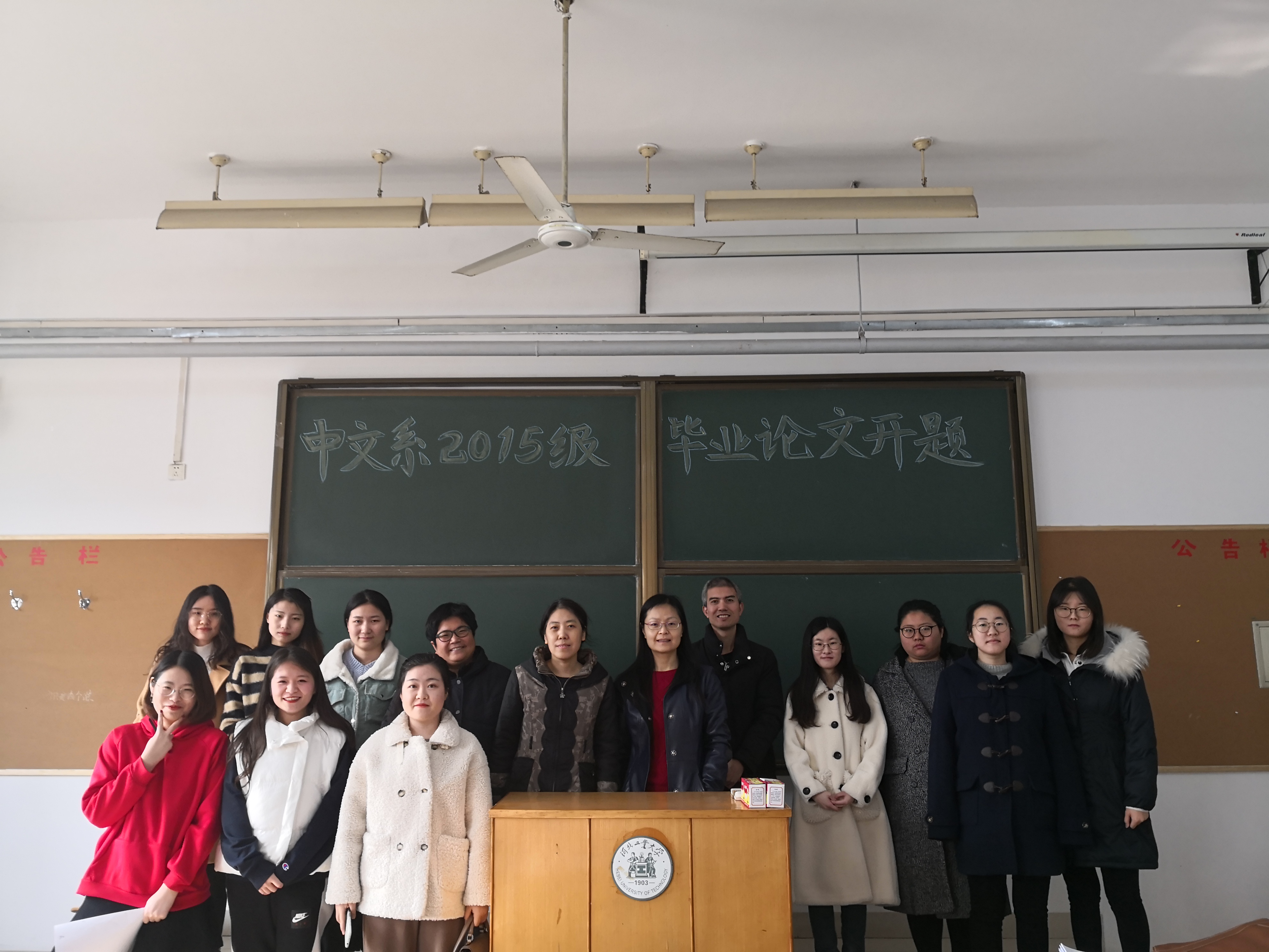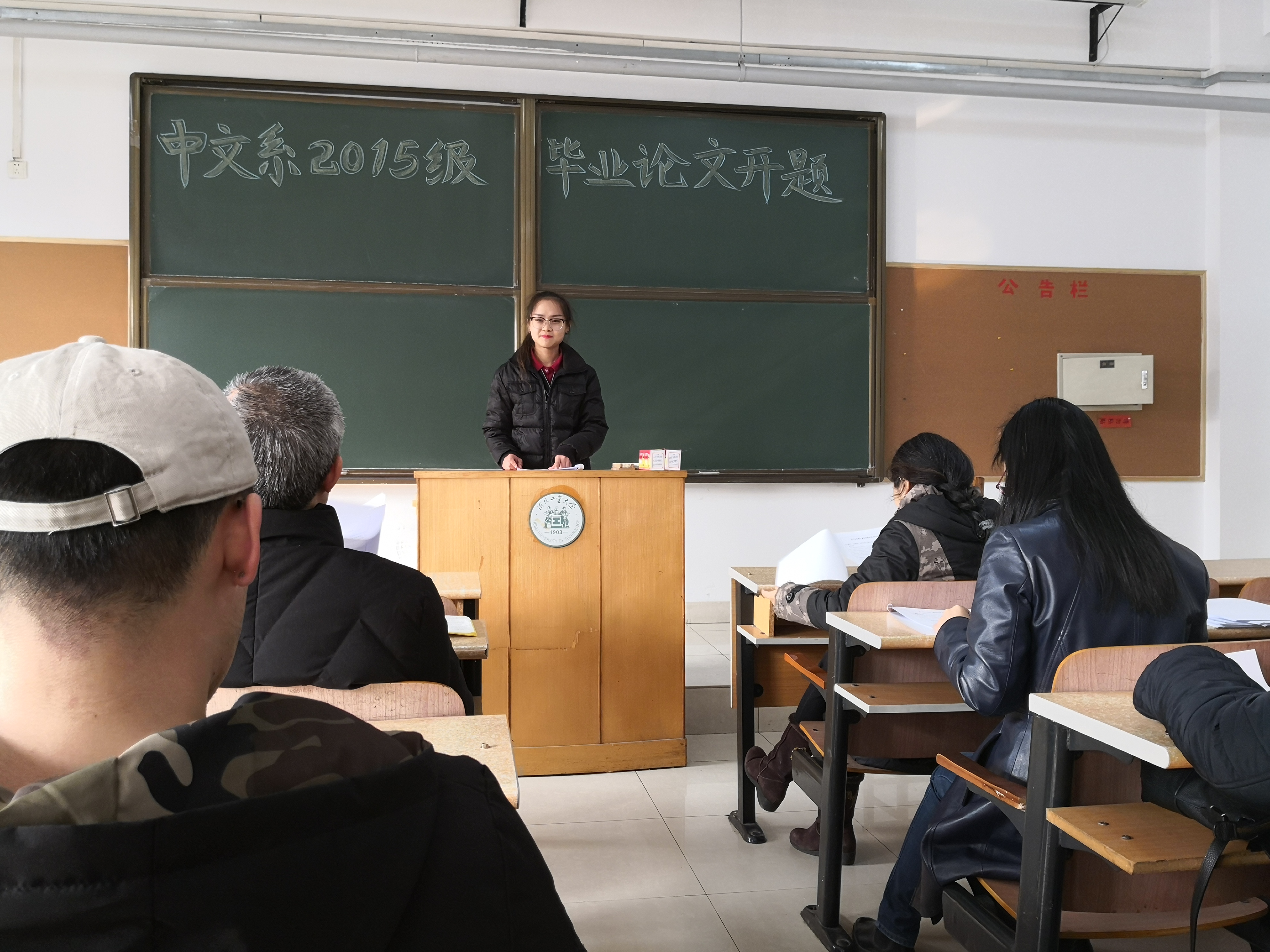 发扬传统,未开学忙开题,教师无私奉献;提振学风,将毕业写论文,学生砥砺前行,2019年2月24日上午八点,中文系师生在教学楼B102、B104教室开启新学期第一项重要活动——汉语国际教育专业2015级学生毕业论文开题报告会。毕业班的全体学生按研究方向分为两组分别进行开题,语言文字组由贾清老师、田文静老师、石彦霞老师、黄娜老师、孙伟龙老师审评,文学文化组由何英老师、牛景丽老师、黄云生老师、赵淑华老师审评。何英老师和贾清老师作为两个组的组长,分别就本届毕业生毕业论文的开题报告会做出了要求,并强调了毕业论文选题的重要性,在毕业论文撰写中需要注意的各种事项等。同学们依次介绍自己选题的内容和意义,研究思路,以及遇到困难等。老师们则对学生的选题的方向、大小等一一点评,并认真回答了学生提出的各种问题。
