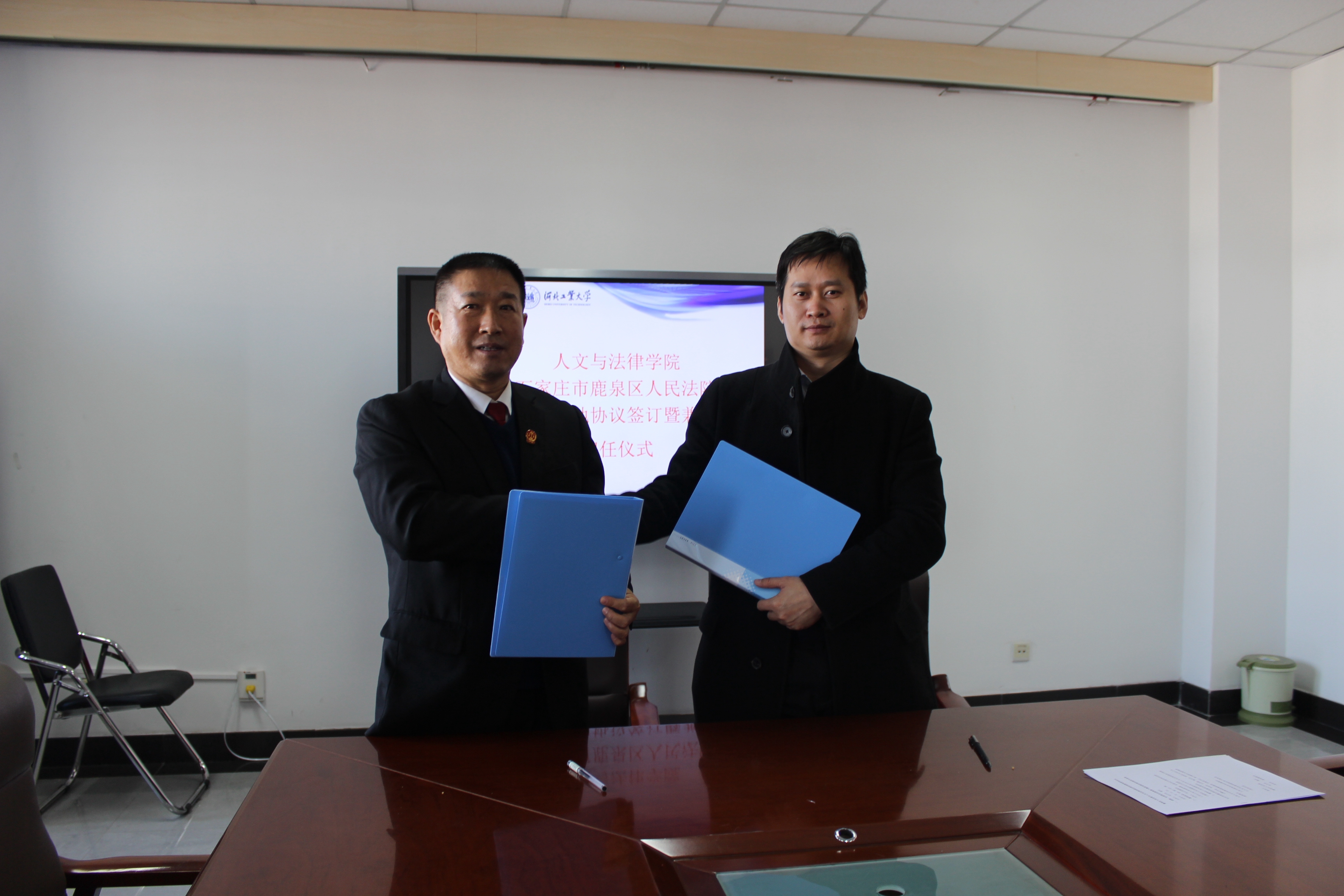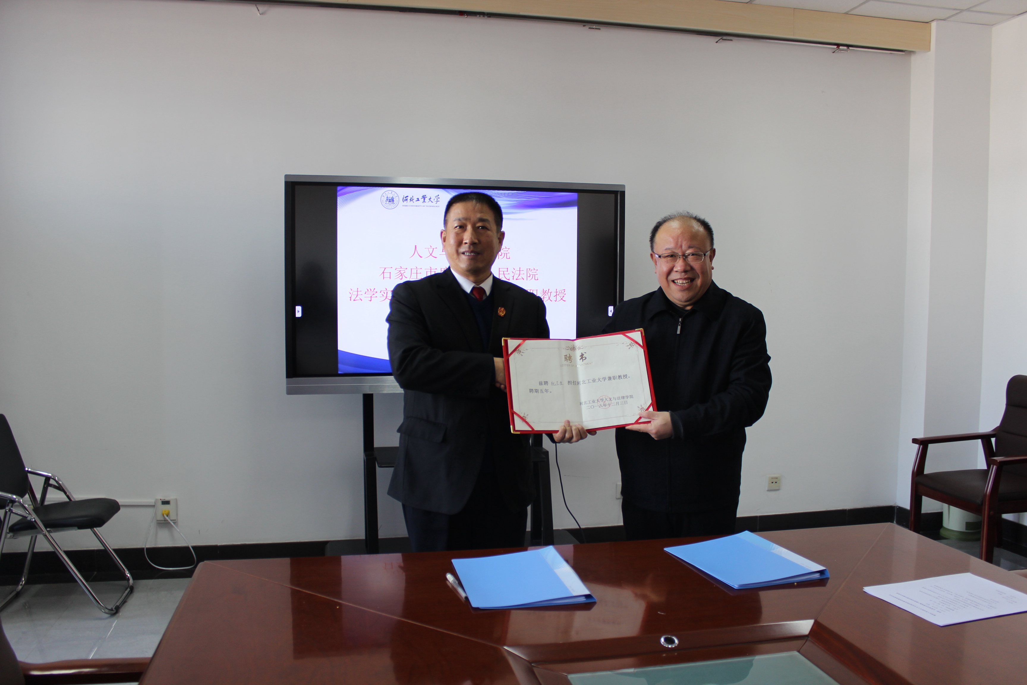2018年12月4日,h视频 与石家庄市鹿泉区人民法院共建法律实践基地签约暨兼职教授聘任仪式在学院517会议室举行。鹿泉区人民法院院长纪兰生、常务副院长辛世杰、副院长王志国、校党委常委、纪委书记刘爱民、h视频 院长李子彪参加了此次仪式。签约及聘任仪式由副院长马立民主持。首先,校党委常委、纪委书记刘爱民表达了对鹿泉区人民法院一行领导的热烈欢迎,同时对学院与法院之间签订实践基地协议表示了祝贺。随后,鹿泉区人民法院纪兰生院长在致辞中表示,希望能够为我校法律人才的培养提供良好的平台和环境,实现双方的良性互动。之后,李子彪院长与纪兰生院长共同签署了法律实践基地共建协议。