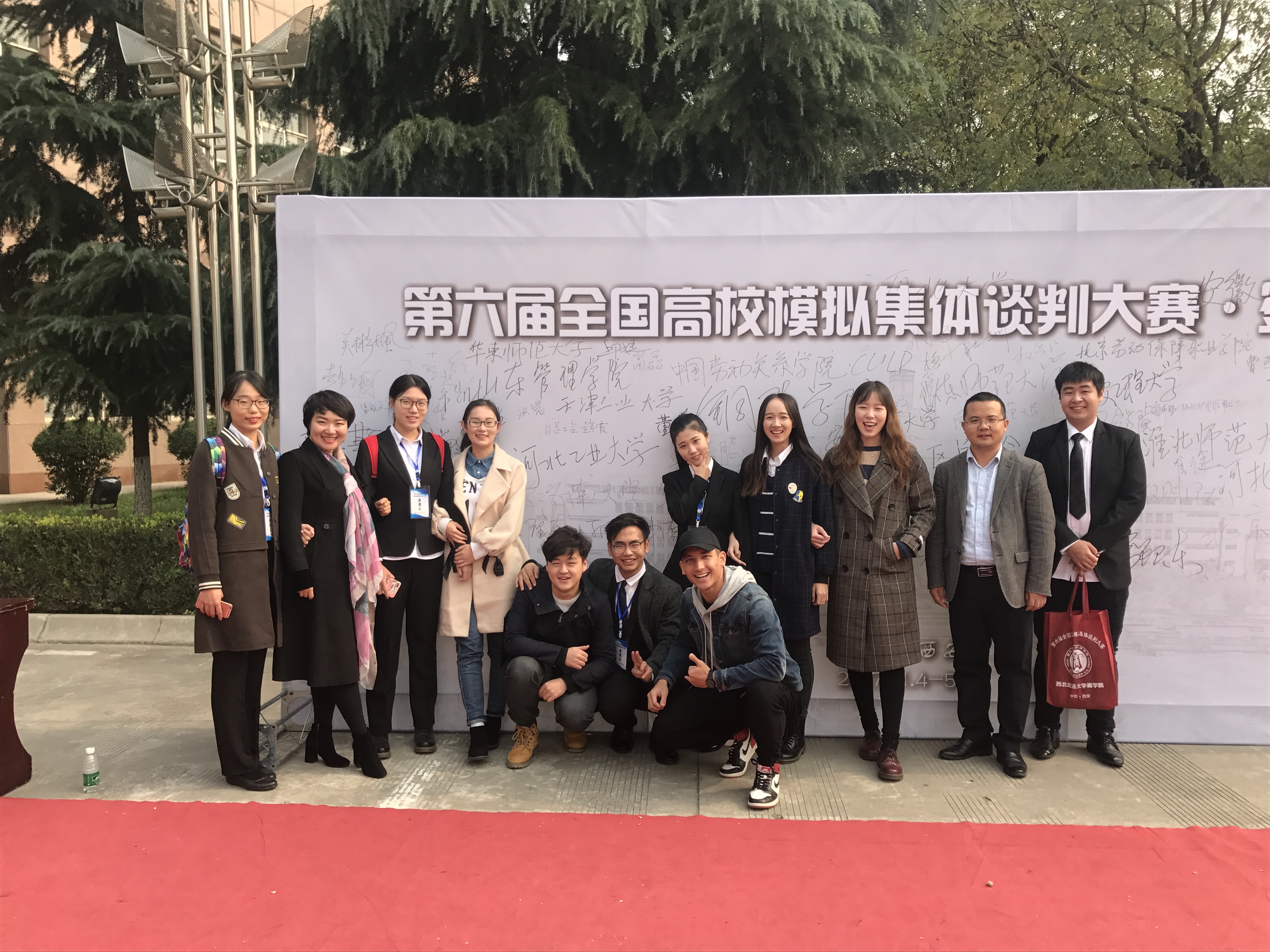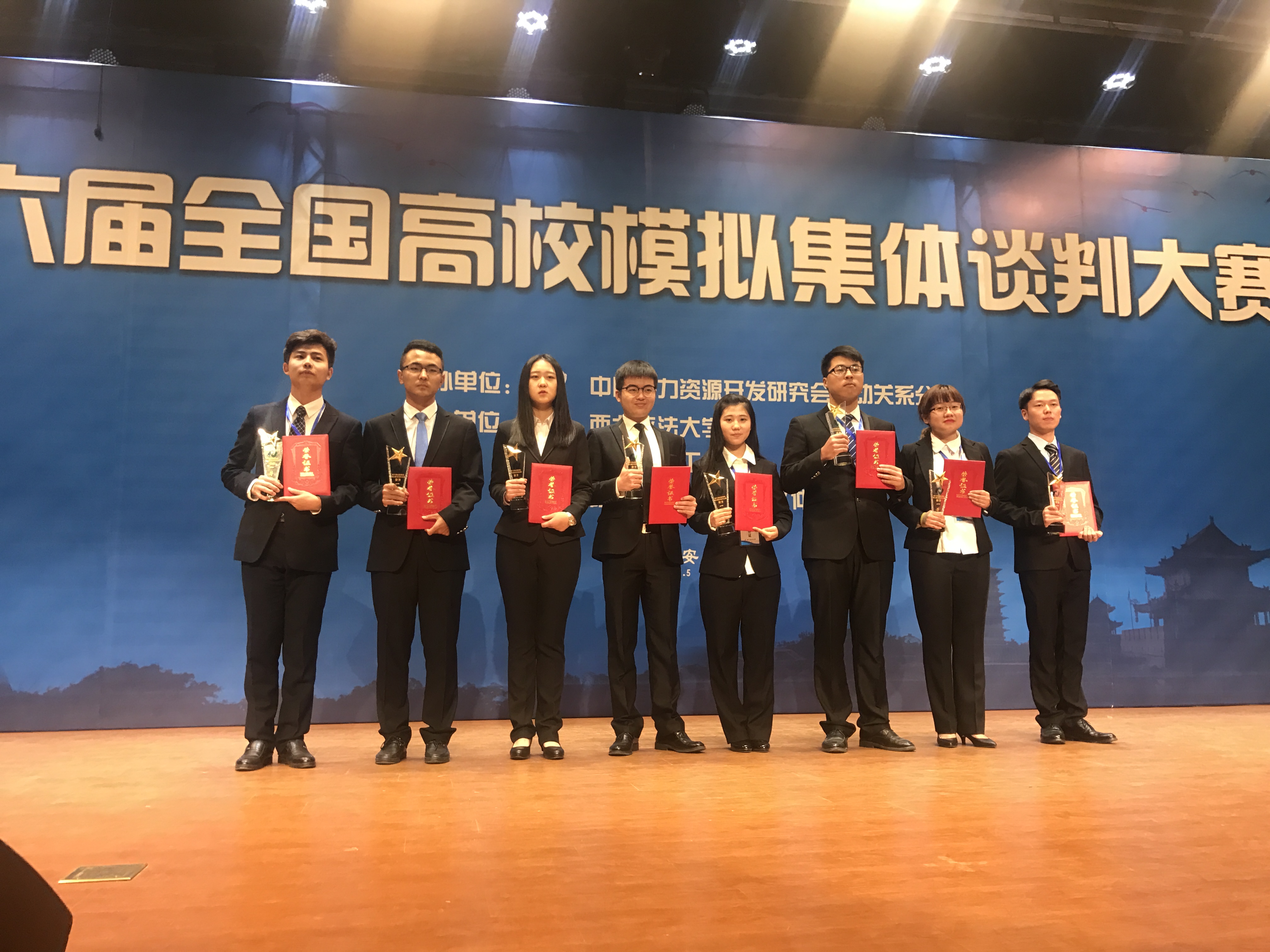 暮秋已至,寒意渐浓。2017年11月4至6日,第六届全国高校模拟集体谈判大赛在西北政法大学举行,大赛由中国人力资源开发研究会劳动关系分会主办,目前已在北京、山东、浙江、天津等地连续举办六届。本次大赛共有 33 所高校参与,共计有 66 支代表队伍,参赛师生人数达 400 多人。我校h视频 经过两个多月的精心准备,通过层层筛选,选拔出法学专业,劳动与社会保障专业共10名学生组成劳方队和资方队两支代表队,参加此次比赛。经过初赛激烈的筛选,我校劳方队一路披荆斩棘,站在了决赛的赛场上。在决赛中,双方谈判就一线员工工资涨幅、企业员工的福利以及增设工龄工资等运用了多种谈判技巧,以退为进,以守为攻,先发制人,为在场的评委和同学上演了一场精彩的视听盛宴。最终,劳方与资方都达成了共识,并签订了集体劳动合同。评委老师对本场参赛的同学们进行了精彩的点评。