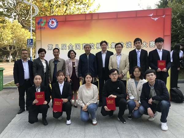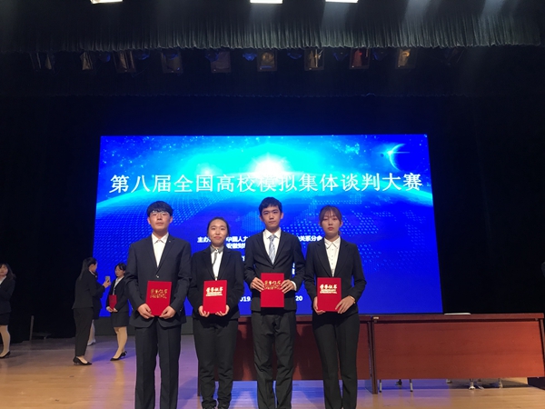 我校共派出两支代表队参加此次赛事,由文法学院闫文博副院长带队,李晋康、周宇航、孙月、郭雅雯四名同学组成劳方代表队,张喜彪、董佳伟、杜梦真、汪伊凡四名同学组成资方代表队。在领队老师的精心指导和队员们的努力坚持下,我校资方代表队斩获全国一等奖,劳方代表队获得全国三等奖,我校被评为最佳组织奖。另外,郭雅雯同学、汪伊凡同学分别获得“最佳谈判员”称号,翟中玉、文太林老师分别获得“优秀指导老师”称号。