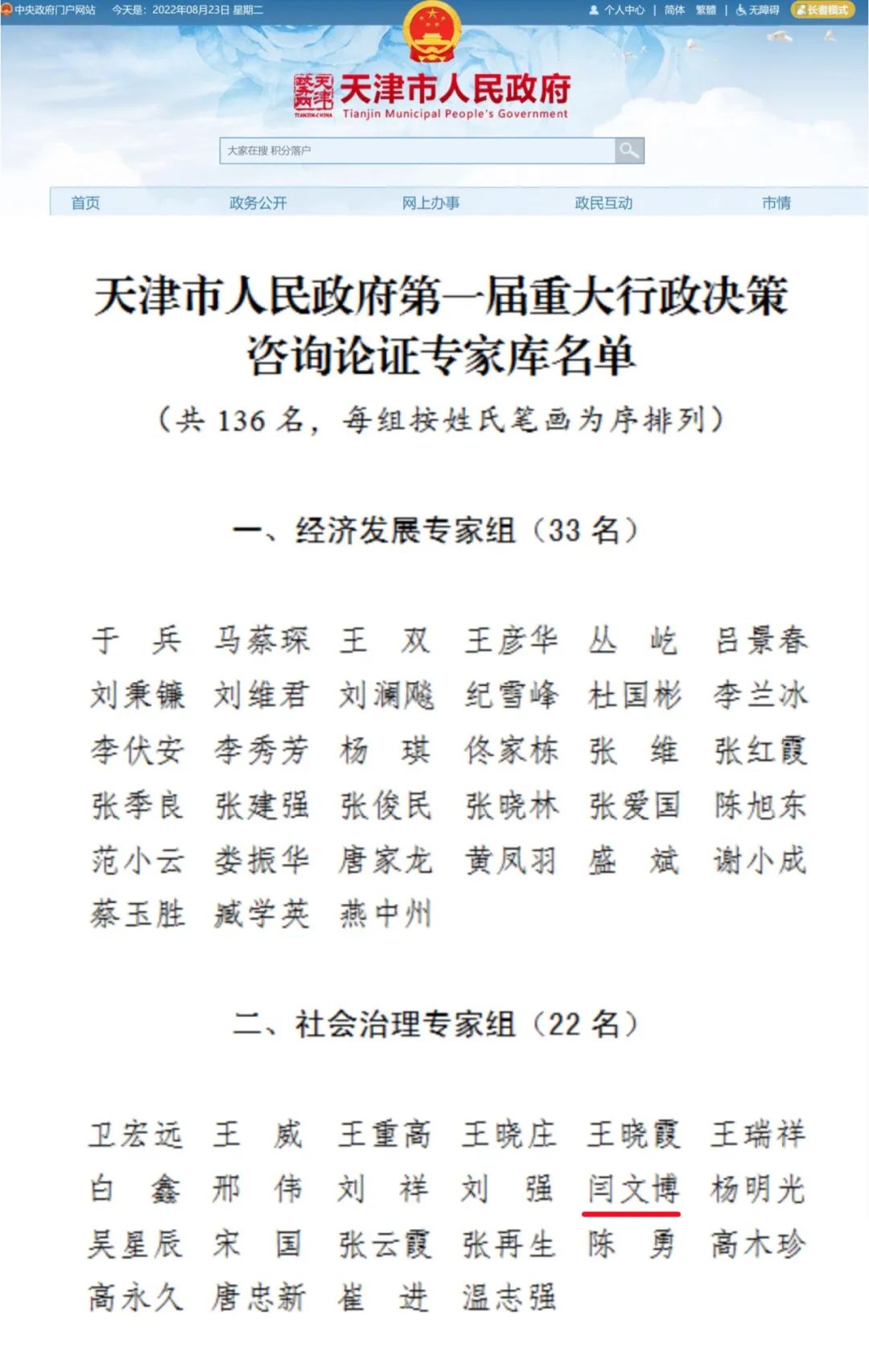 2022年8月17日,天津市人民政府发布《天津市人民政府关于第一届重大行政决策咨询论证专家库名单的公告》,h视频 闫文博副教授入选天津市人民政府第一届重大行政决策咨询论证专家库-社会治理专家组。
