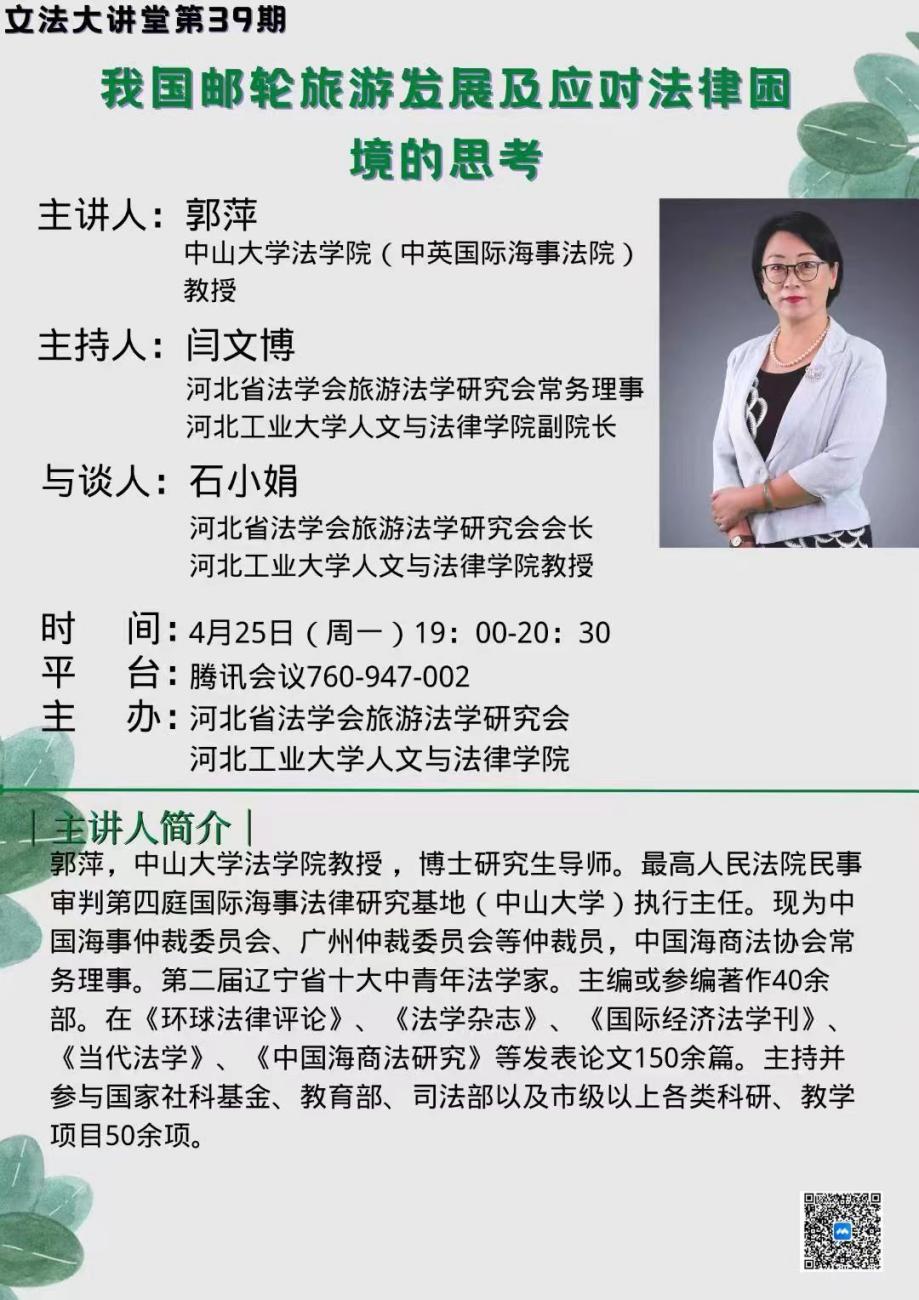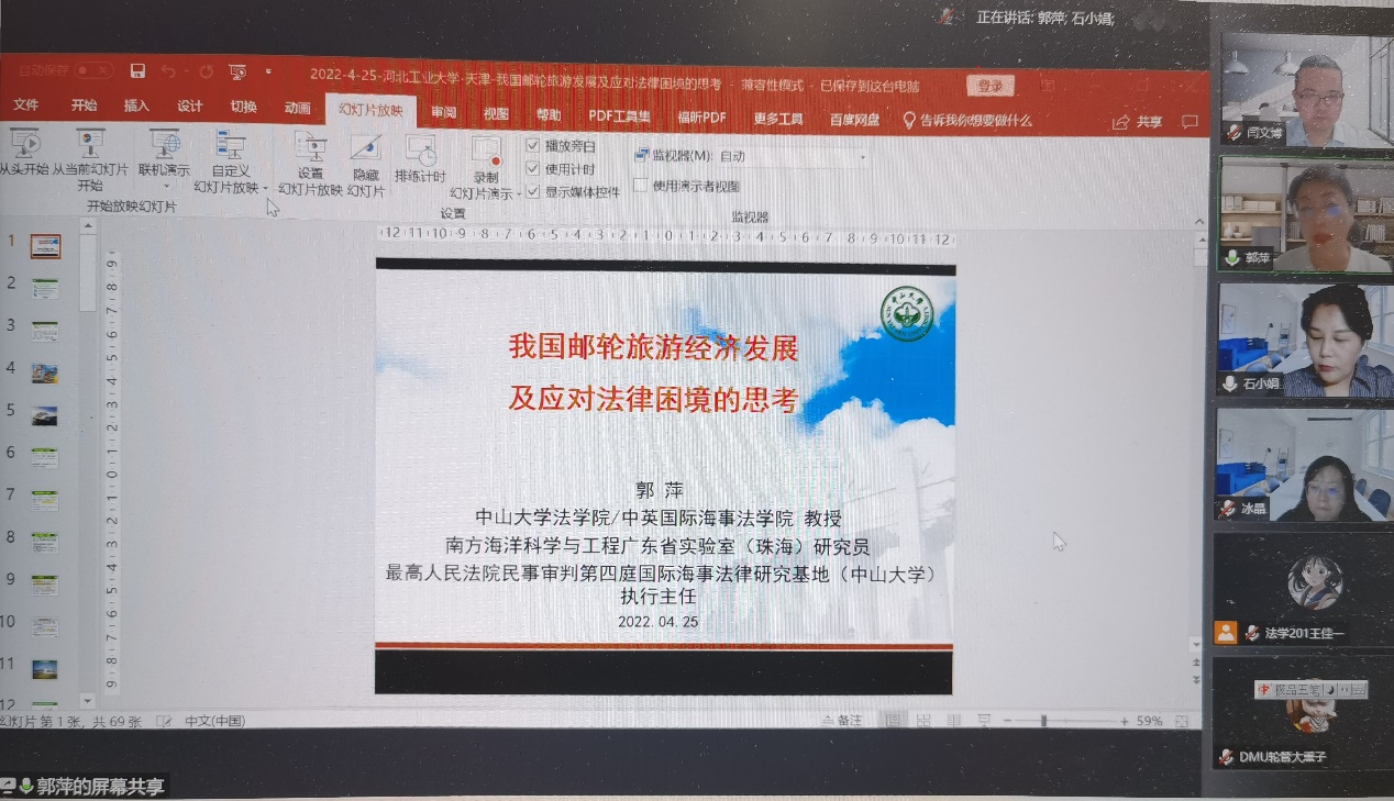 4月25日晚,河北省法学会旅游法研究会、h视频 举办了题为“我国邮轮旅游发展及应对法律困境的思考”的线上讲座,主讲人为中山大学法学院(中英国际海事法学院)教授、中国海事仲裁委员会仲裁员郭萍。h视频 师生以及河北省法学会旅游法研究会的会员二百多人一起聆听了本次讲座,本次讲座由河北省法学会旅游法研究会常务理事、h视频 闫文博副院长主持。