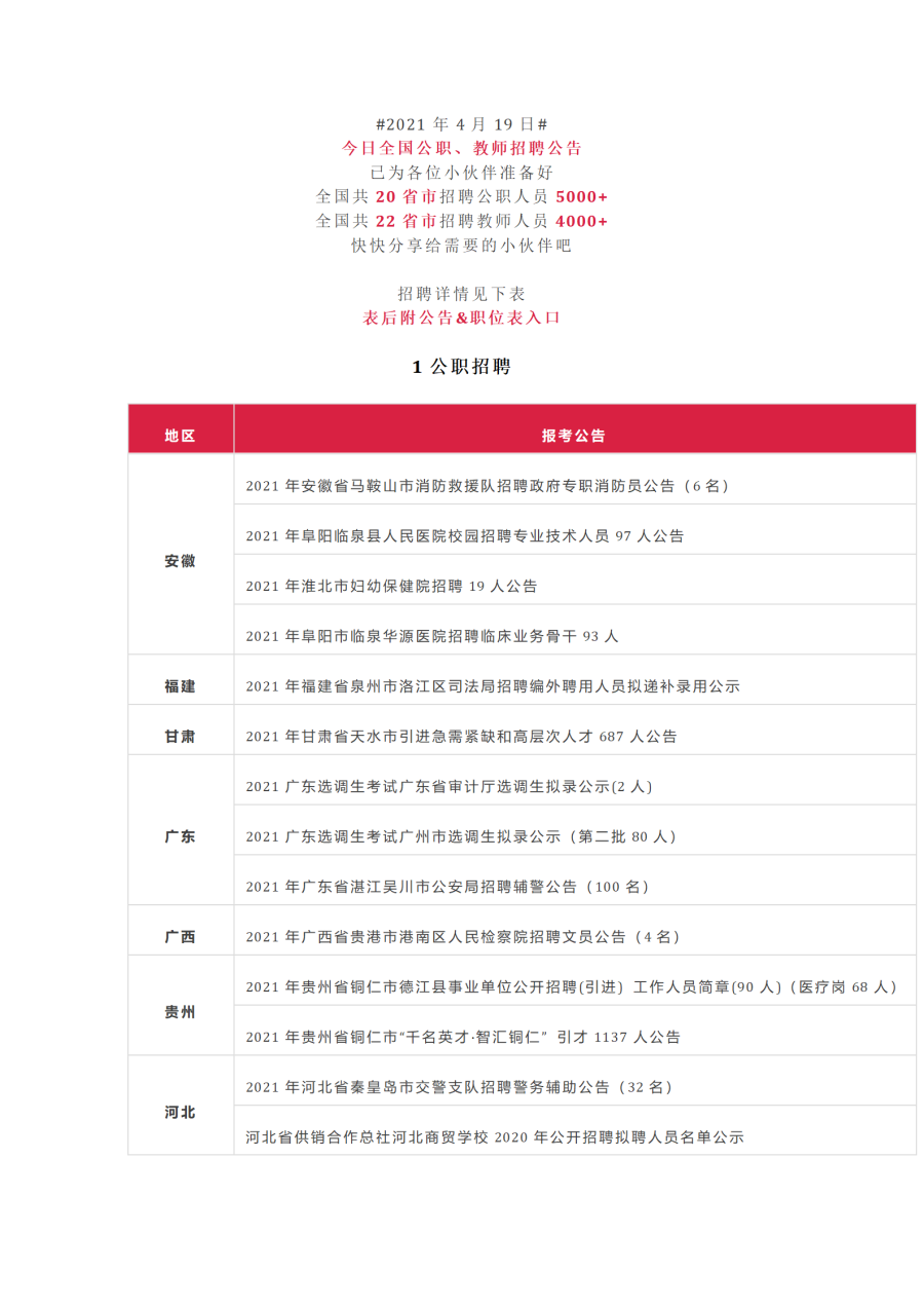 今日招聘:全国招9258人 教师、医疗、辅警等岗