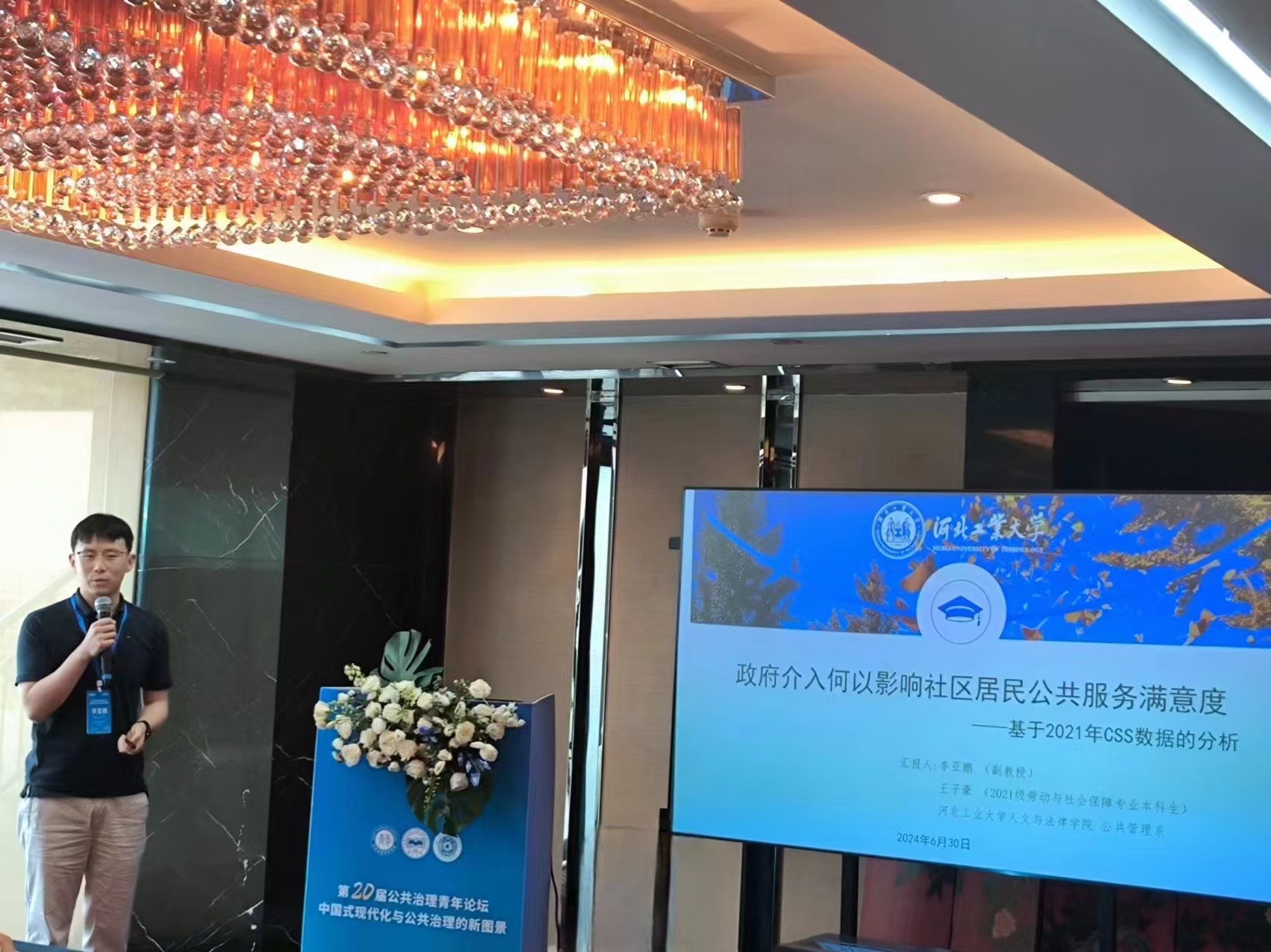 h视频 李亚鹏老师与2021级公共事业管理专业本科生王子豪受邀参加第二十届公共治理青年论坛暨“中国式现代化与公共治理的新图景”学术研讨会。李亚鹏老师与王子豪同学撰写的《政府介入何以影响社区居民公共服务满意度--基于2021年CSS数据的分析》一文在平行分论坛“政府治理现代化(上半场)”进行了专题发言。此外,李亚鹏老师作为主持人主持了“政府治理现代化(下半场)”分论坛。