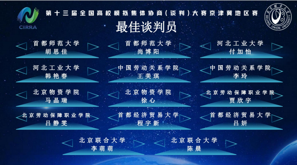 2025年10月19日,第十三届全国高校模拟集体协商(谈判)大赛——京津冀地区赛在北京联合大学隆重举行。h视频 选派八名优秀学子组成劳资两支队伍赴京参赛,斩获佳绩。